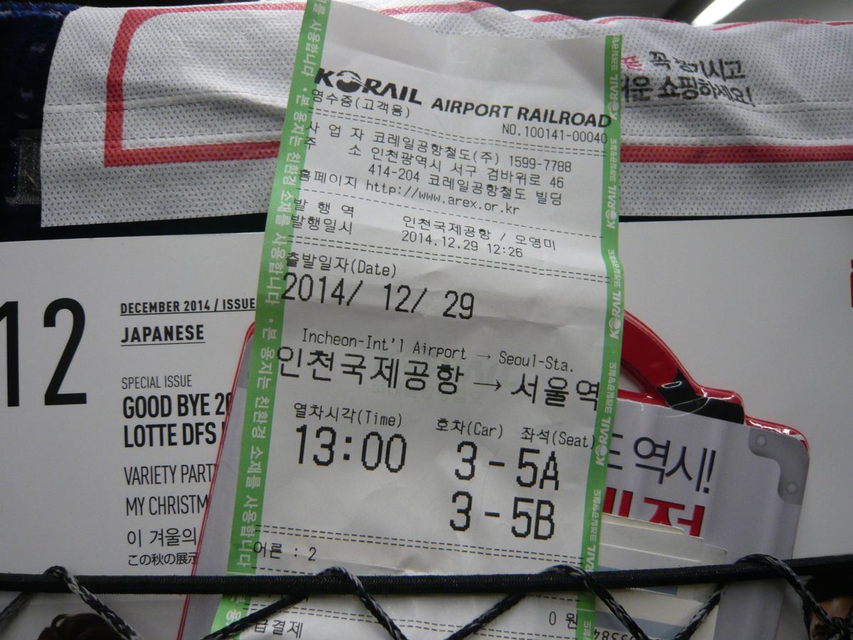 窓口でバウチャーを見せたら、そんな予約番号ないし、第一、桁数が違いますよと綺麗な女性駅員に言われてドキマギ。バウチャーの最終乗車可能日が2014年12月31日となっているのも不審そうでした。じゃあここに電話してよとバウチャーに記載してあった電話番号にかけてもらっても誰も電話に出ない様子。。(朝5時だもんね)美人駅員がしばらくバウチャーを見ていてVeltraの文字に気づいたらしく何やら書類綴りを取り出して、あったあったと結局発券してもらうことができました。veltraのバウチャーに韓国語か英語で何か説明がないと慣れない駅員さんはとまどうのではとないかと思います。上手に英語を話す美人駅員さんで良かったけれど。