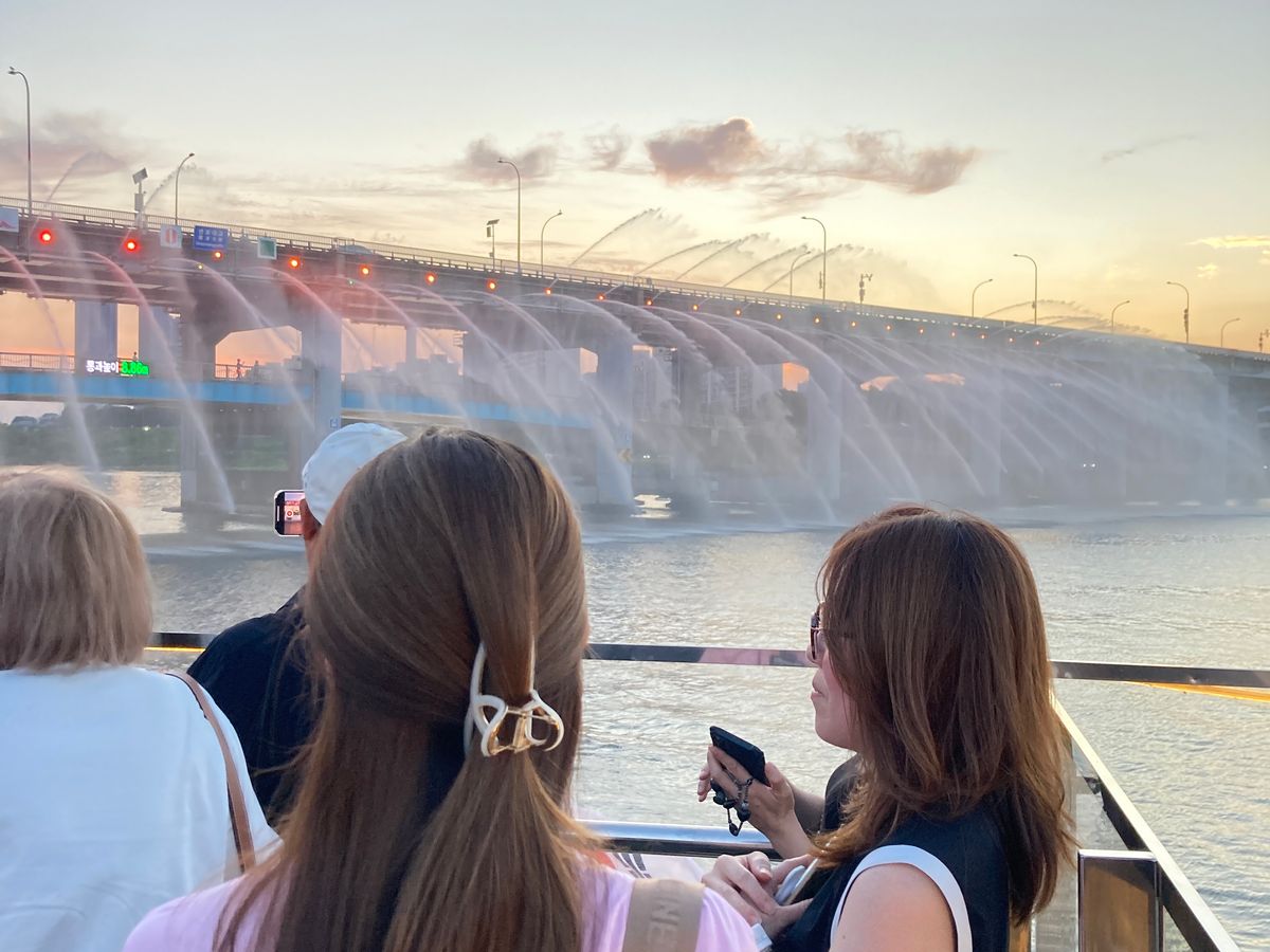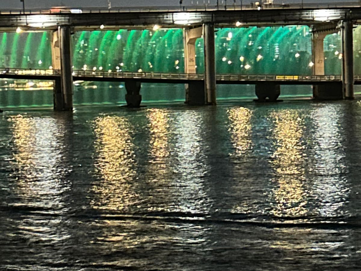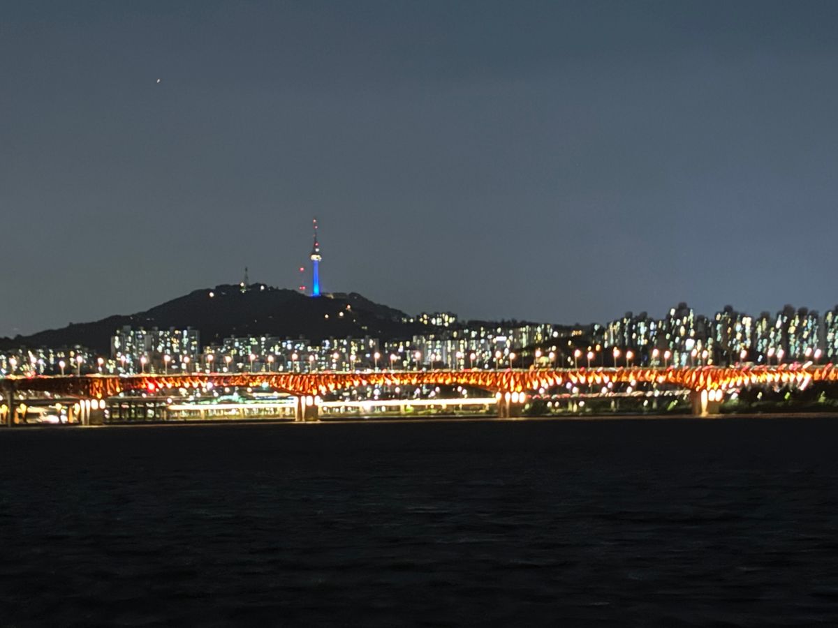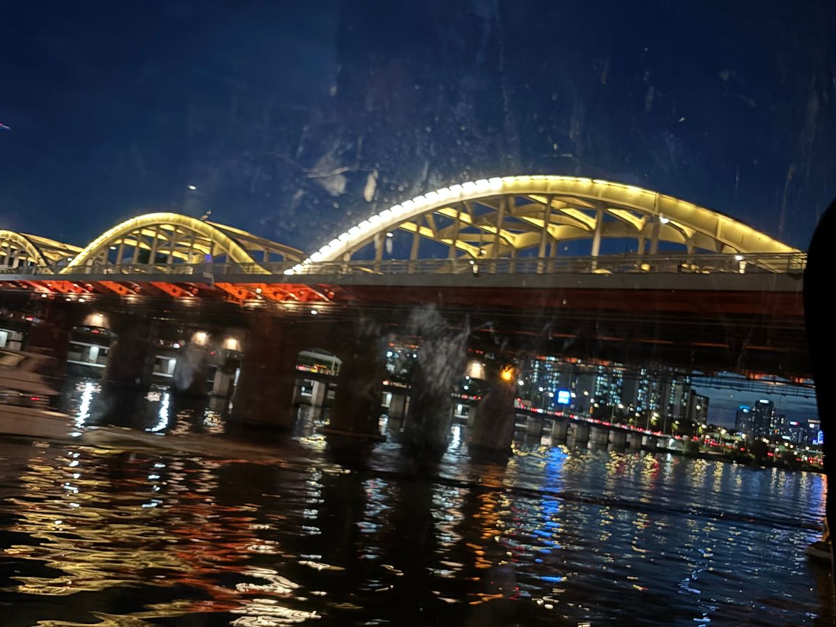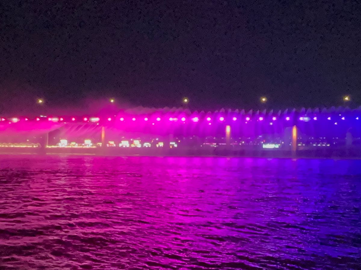 船からの景色は陸から見るのと全く違って、夜景が美しくとても感動しました。蚕室から出発して汝矣島までをクルーズ。盤浦大橋が近くなってくると、レインボー噴水が見えてきました。船だとかなり近くまで行くので、それは素晴らしい景色を見ることがてできて、船に乗ってよかったと思いました。
