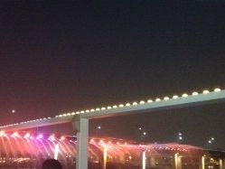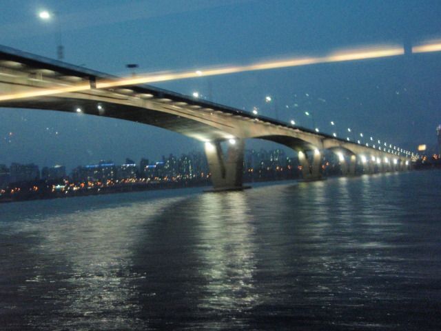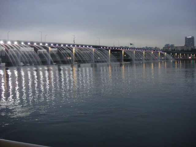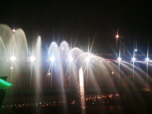 漢江ライブ遊覧船から見た盤浦大橋(バンポデギョ) の長さ1140メートルにも及ぶ月光レインボー噴水ショーは圧巻でした。