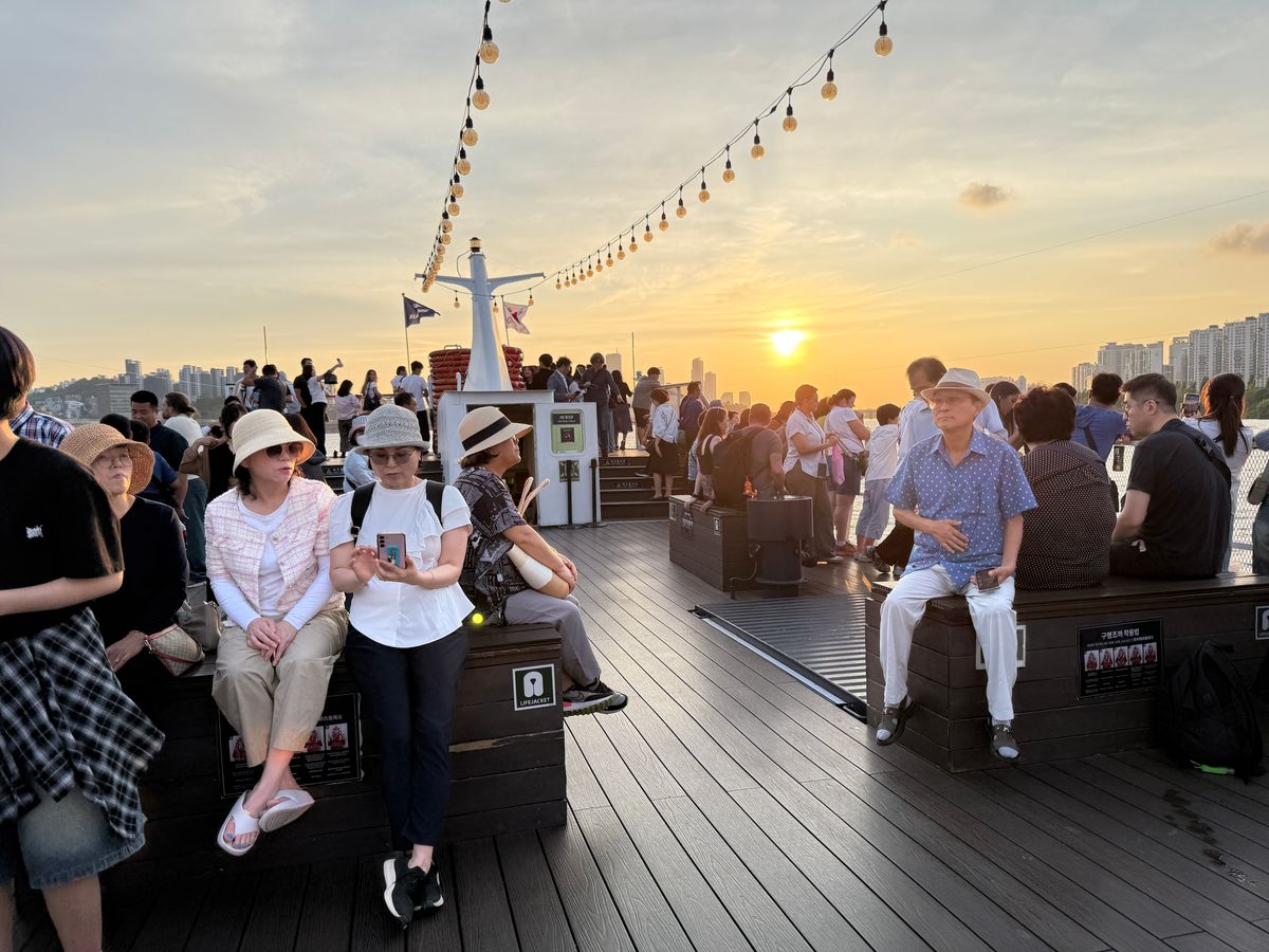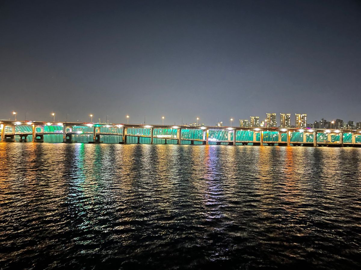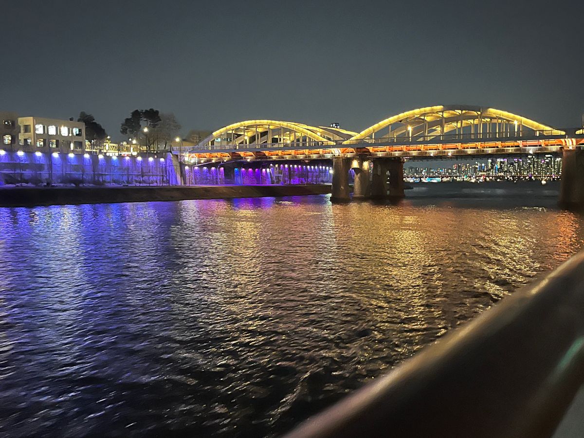 19時からのコースに乗車しました。夜景を楽しみながらのクルーズかと思いましたが、6月の韓国の日の入り時間は20時近くのため、夜景には少し早かったです。噴水ショーも見ることができましたが、まだ明るくライトアップもされていませんでした。とはいうものの、川から眺めるソウルの街はとても趣がありました。下船する頃にはいい感じに暗くなっており、下船後は公園をのんびり歩きながら夜景を堪能できました。2階のデッキで風を感じながら、船内のCU(コンビニ)で購入したビールを飲む。なかなか素敵な体験でした。