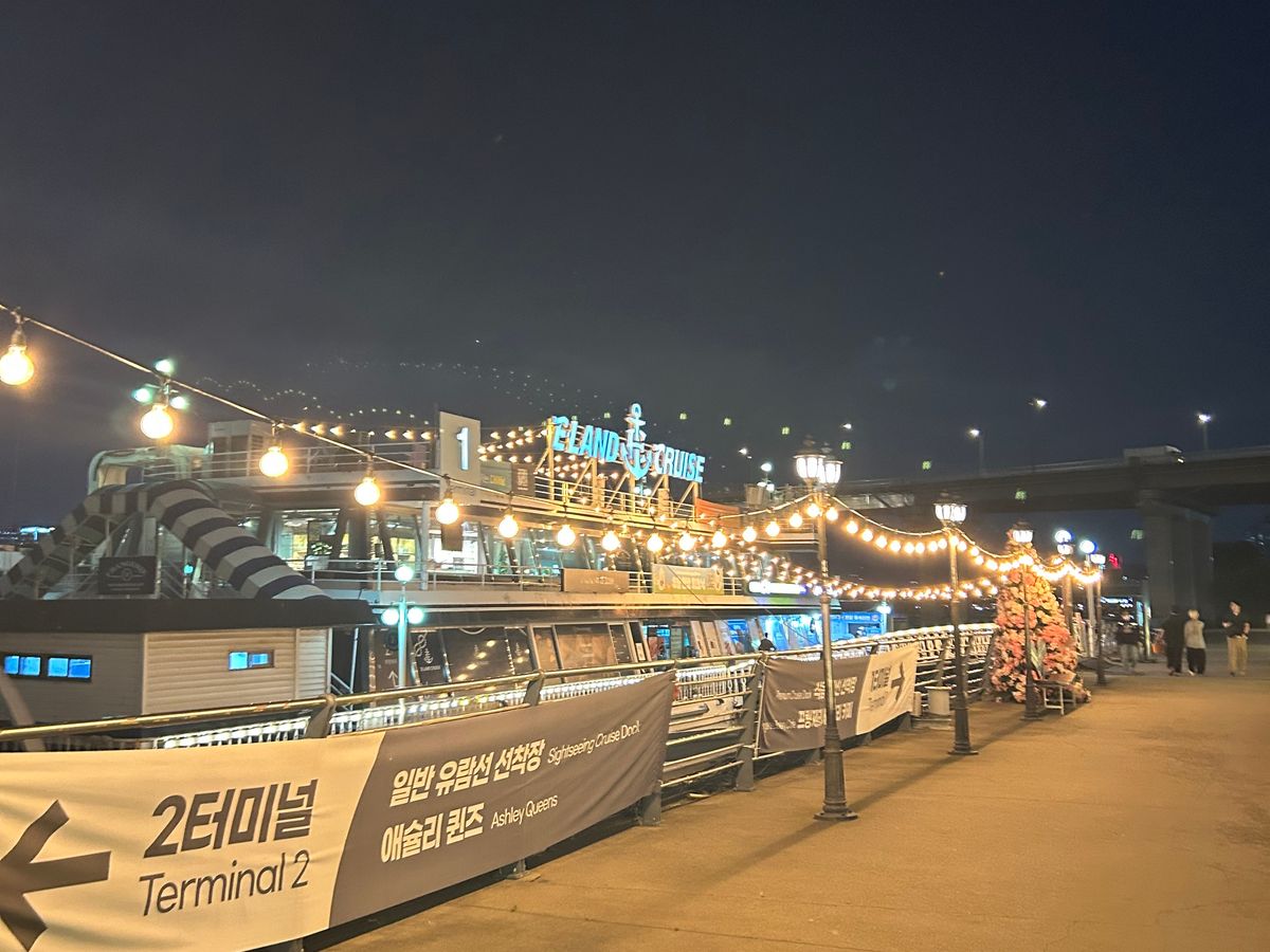 クルーズでは、甲板に上がって写真撮ったりと、少し景色を楽しんだものの、すぐに寒くなり中の売店でホットコーヒー買って下の座席で飲みながら、(百貨店で買ったパンも食べながら)夜景見てました。クルーズ折り返しくらいから?の歌手の人の歌も良かったです。帰りも明洞まで送ってもらえて良かったです。カップルや、家族で行くには良いコースかな?と思います。(友達は、百貨店はあってもなくても良いかなー?との事でしたが。)