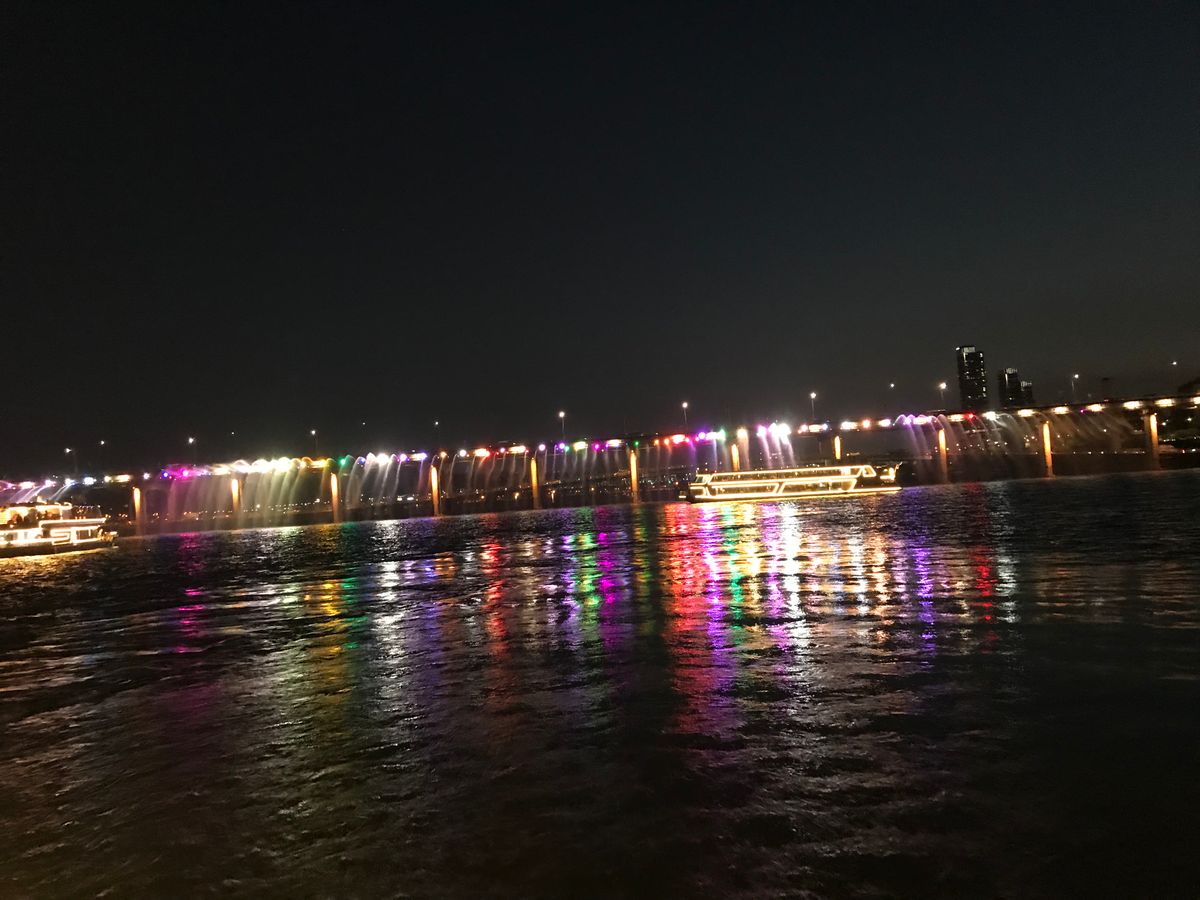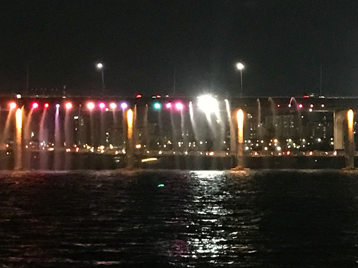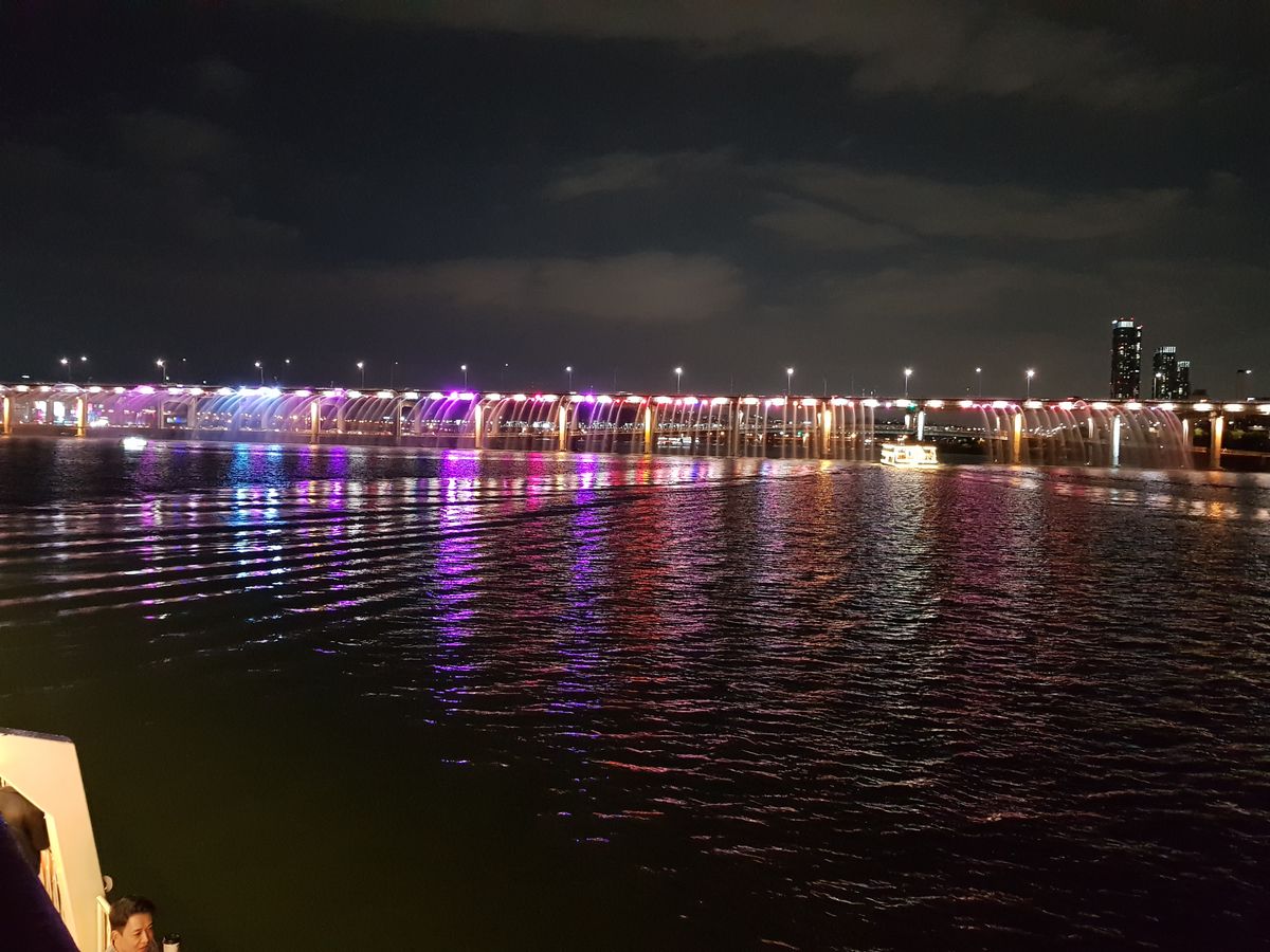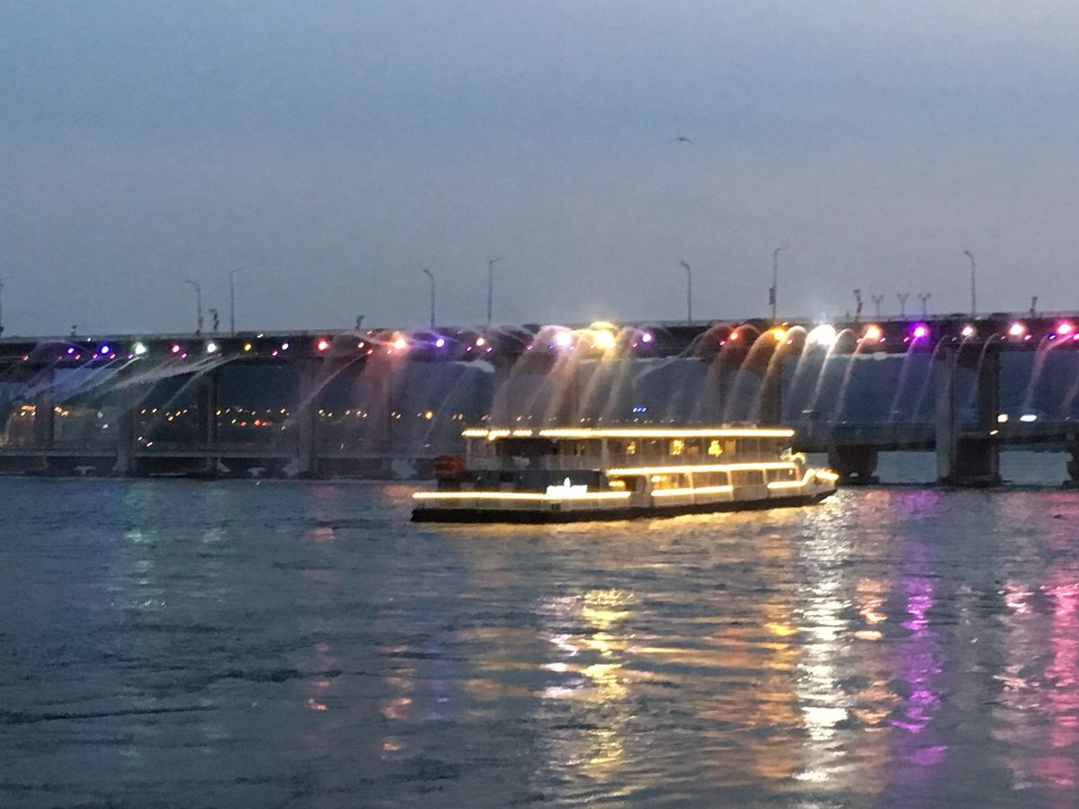 クチコミを見てすごく楽しみにしていましたが漢江ナイトクルーズで橋から虹色の光と共に噴水の水が出ていたのですが船が橋まで近づいてくれず遠くの方がでの見学となり全然感激しませんでした。