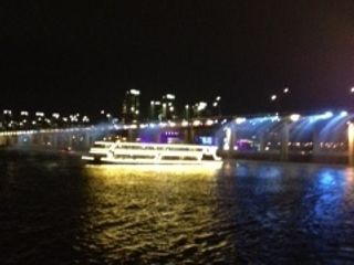 漢江の遊覧船は、とてもロマンチックでした。近くの公園では家族や、カップルはシートを敷いてみんかリラックス。船の上ではカップルが幸せそうに写真を撮っていました。レインボーの噴水は少し遠く、思ったよりレインボーではありませんでしたが街の灯りや他の船の灯りでロマンチックナイトになりました。