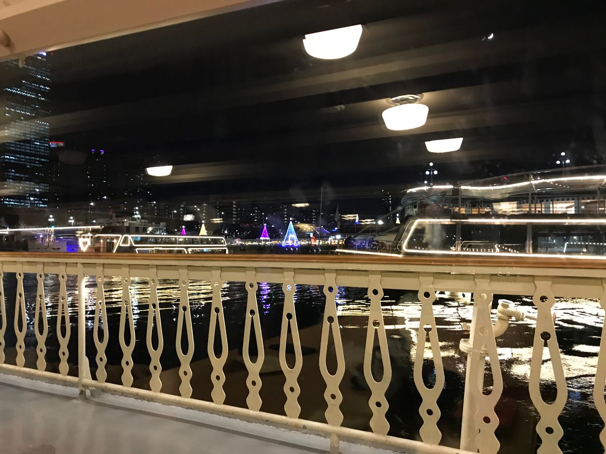乗船して20時位からライトアップの所が見えるとのことで、中に座ってそれまで待って、10分くらい前に外に出てカメラを構えて待っていると、始まる時間の少し前にクルーの方が「下がって!下がって!」と言うので中に入って見ないといけないんだ」と思って中に入りました。そしたらやっぱり船内からはガラスに反射していい写真が撮れないではないか!!と思って立ち上がって、外が見えるところに行ったら、通り過ぎてしまった橋が綺麗に見えました!