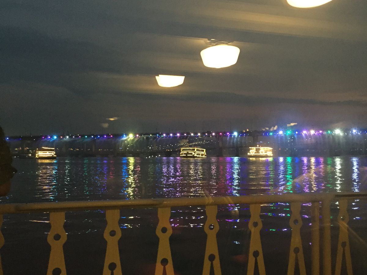 2回くらい違うライトアップされた橋を通るチャンスがあって、「次こそは近くで見たい!」と思って待ってると、また、「下がって!水に濡れるから!」と言われましたが粘ってカメラを構えていたら、次は橋から水が出てるところが船が進むにつれて近づいてきて、「キャー!!!」となりましたが、それも面白くて、全然濡れなかったから結果楽しかったです!しかも、すごい綺麗でした!(^O^)
