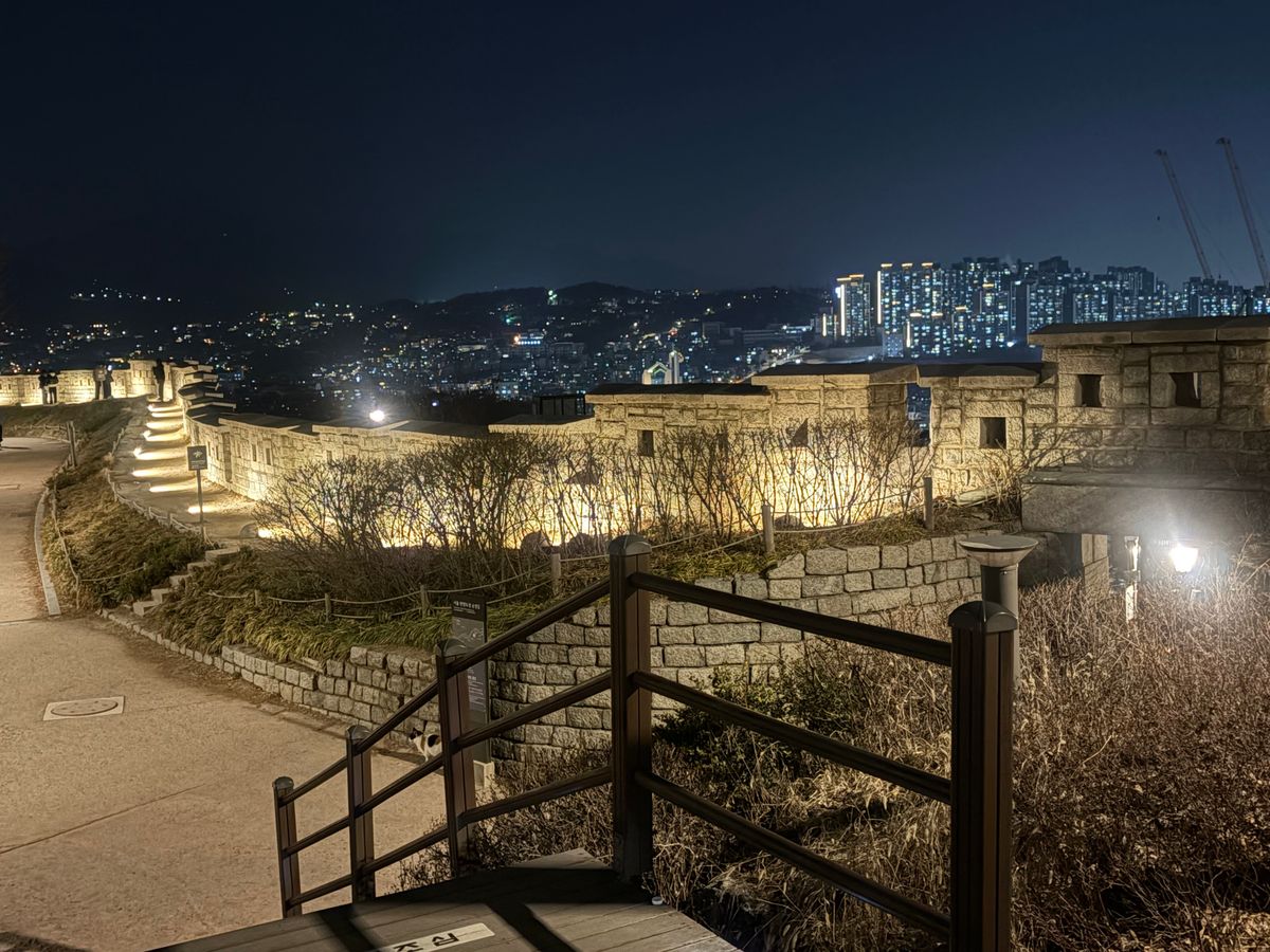 雨が降ったり止んだりで、霧が立ち込めてNソウルタワーは全く見れませんでした。しかし雨でもレインボー噴水は開催され、すごく感動しました。さらに駱山公園ではライトアップされた城壁跡が美しかったです。