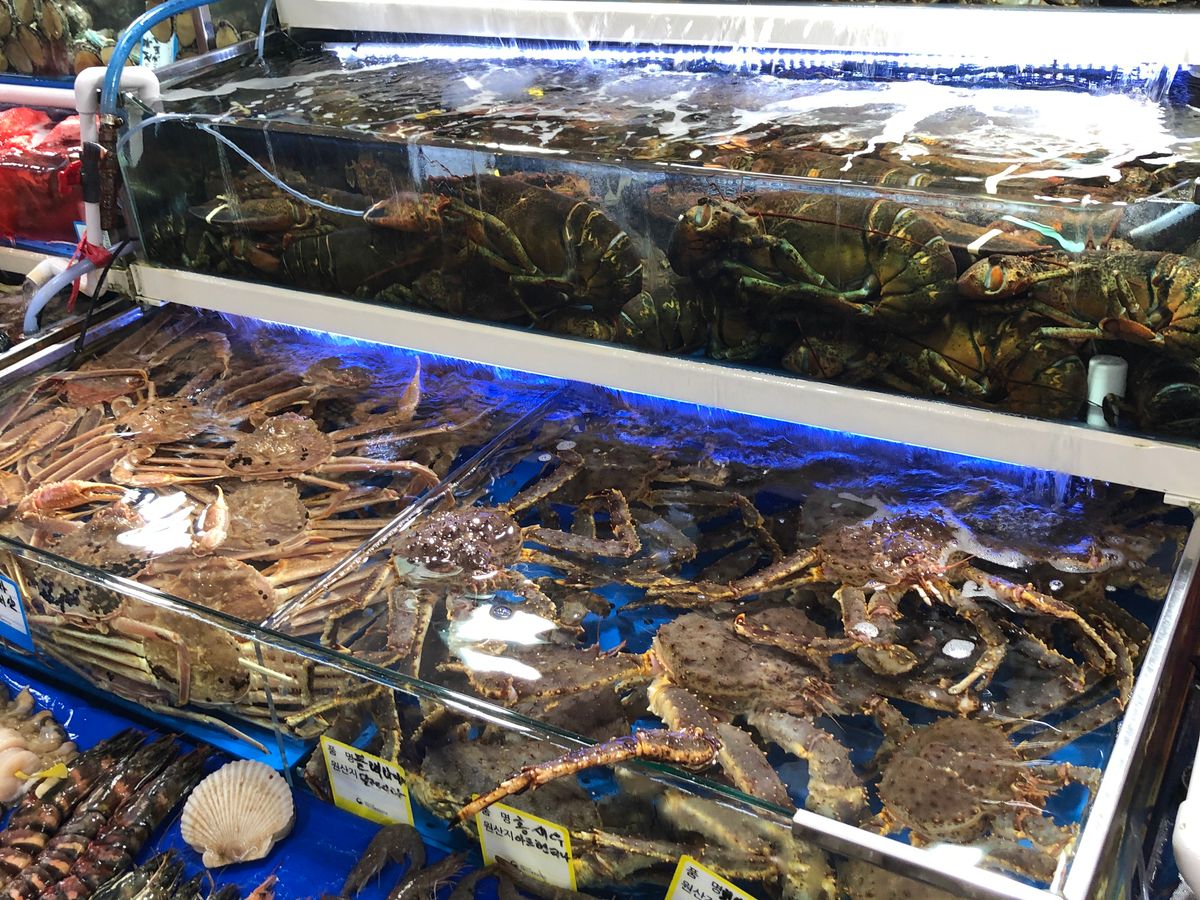 広い市場の中に、所狭しとお店が並んでいて、ひらめや鯛・カニなどが水槽の中にたくさん!!