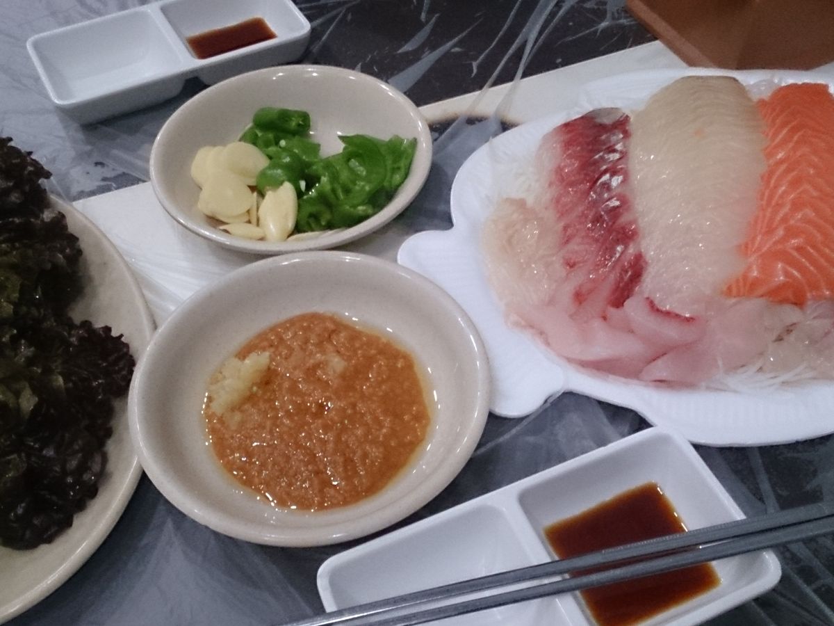 当日のメニューはイカの刺身・あわびの刺身・なまえは忘れましたけど黒い魚の刺身とメウンタンでした。