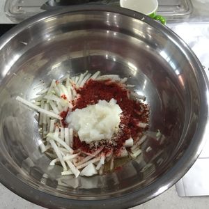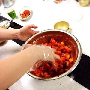 Wooさんが明るく楽しく教えてくださるので、一人参加でも全く心配ありません。単にキムチの作り方を教えてくださるだけでなく、韓国人にとってキムチとは?とか、現在のキムチ事情とか説明してくださるのも興味深かったです。