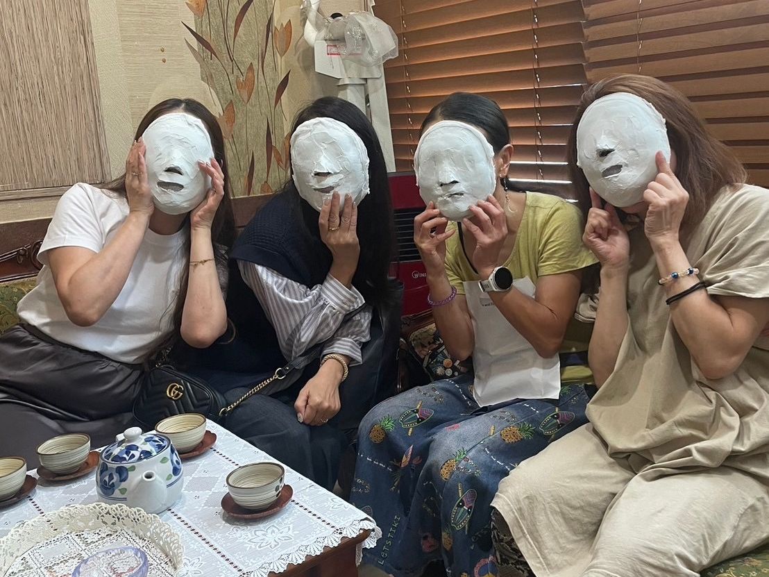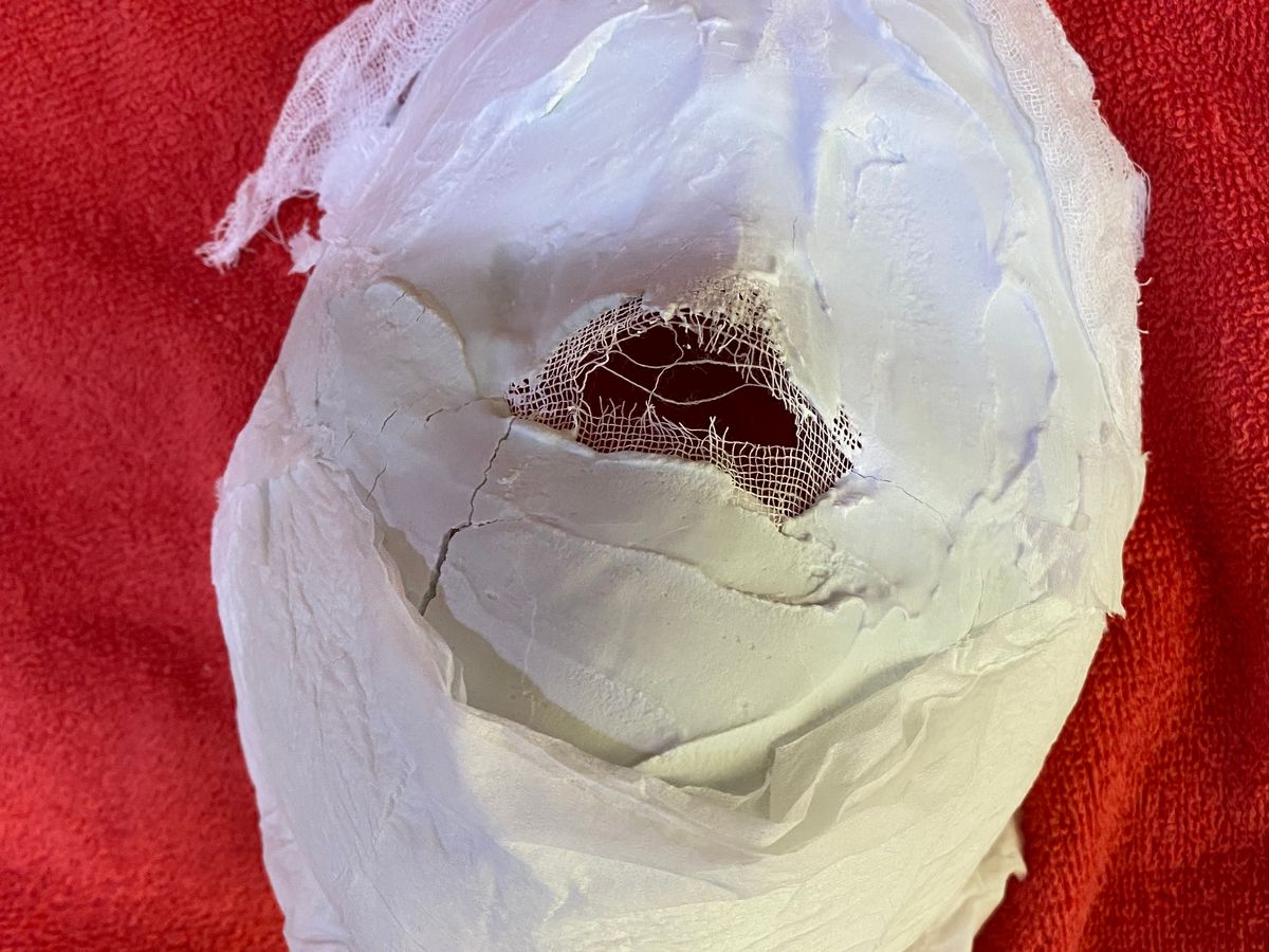 そのあとコルギで、激しく顔を叩くような刺激の後に石膏を塗ってもらい包帯で硬めに縛られて硬化、乾かす時間がありました。