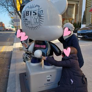 そして、誰を推しているのかをチェック。そこから先は、推しの名前で我々を呼んで導いてくださいました。最初は気恥ずかしくて躊躇ってしまう我々でしたが、その壁を軽々と飛び越え、推し活らしい楽しみ方を伝授してくださいます。旅に出たら恥ずかしいなんて言ってたら損しちゃいますという教えに従い、次第に我々もノリノリで、その世界観を120%楽しむことに没頭しました。BGM付きの撮影会で、恥ずかしさの殻を破ってくれました。我々が、事故に遭わないように常に目配り、気配りを忘れず、時に、命がけで撮影してくださいました。途中予定外のトイレ休憩にも臨機応変に対応してくださいました。運転手さんも、本当に安全優先の運転で安心して移動ができました。車内でも、ARMYの痒い所に手の届くとっておきの情報も提供してくださいました。最後は、宿泊ホテルまで戻れるように配慮してくださって、本当にありがたかったです。もう一度キムさんガイドの別のコースに参加したいです。外は氷点下の凍りそうな気温でしたが、心はポカポカ、笑いの絶えない期待を上回る満足度でした。帰国してからは、廻った聖地のMVを観て、再度感動の復習ができるツアーです。