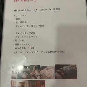 マッサージ前の説明が丁寧でした。コルギだけでなく、首肩頭皮、足裏、脚のもみほぐしが最高でした。機械で腰のマッサージもできます。また顔も、コルギ以外にクレンジングから機械を使ったリフトアップ、モデリングパックまで付いていました。追加メニューでアクアピーリング(30000ウォン)をしましたが、これが個人的にめちゃめちゃ良かったです!次の日Tゾーンがスベスベになりました!