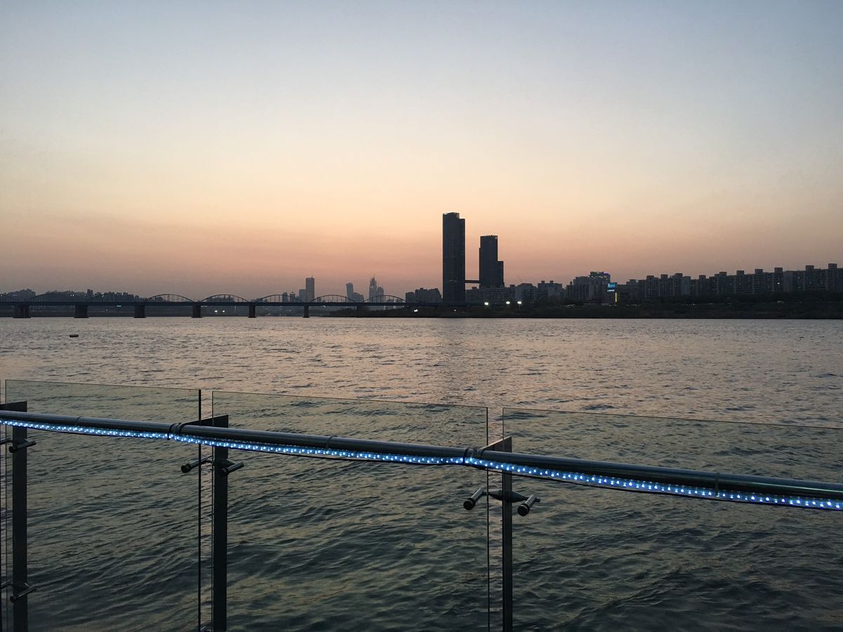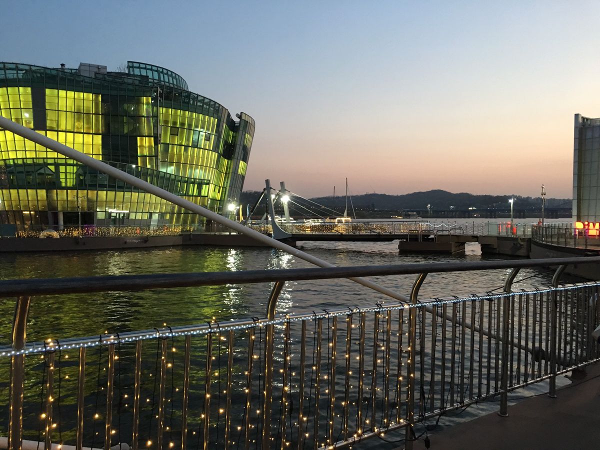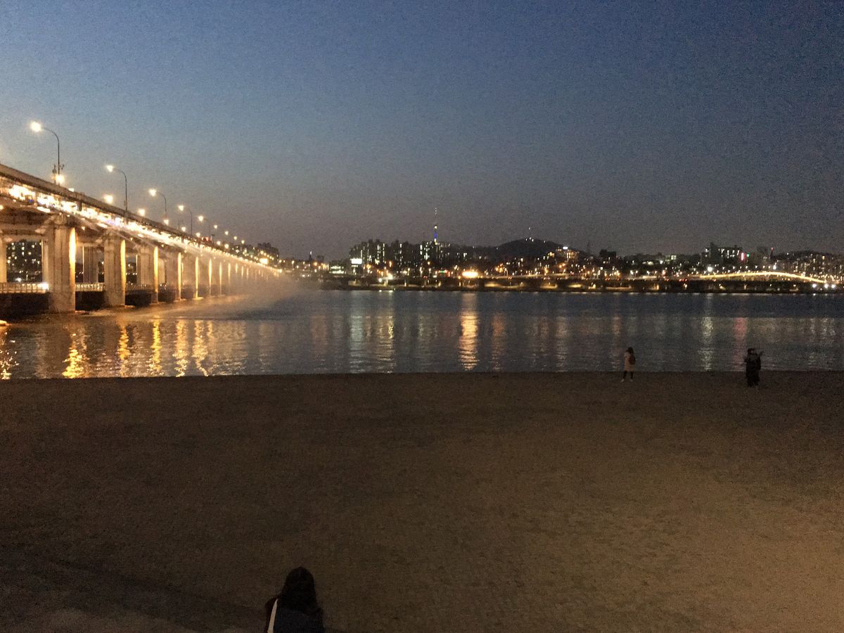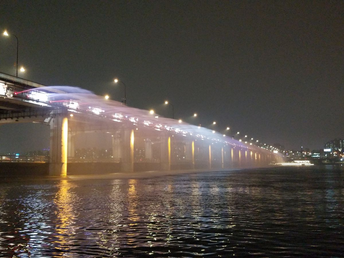 盤浦大橋(バンポデギョ)レインボー噴水ショーはまだ少し明るかったので色はくっきりは見えませんでしたがライトアップの夜景は見る事ができました。川近くなので羽織物を持って行った方がよさそうです。