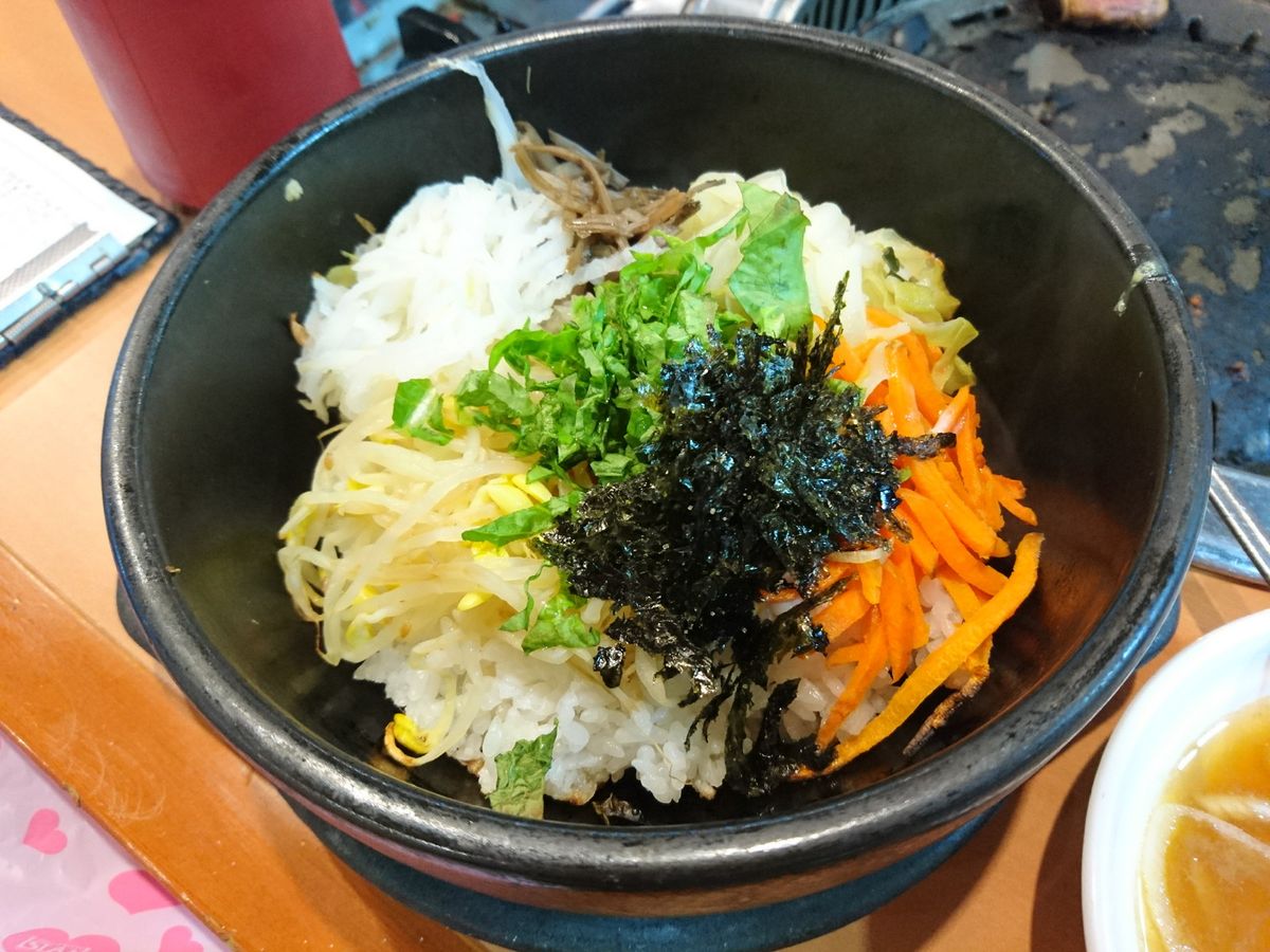 夕食の骨付きカルビ、お肉も、付け合わせのおかずたちも、追加注文した石焼ビビンバも全て美味しかったです。
