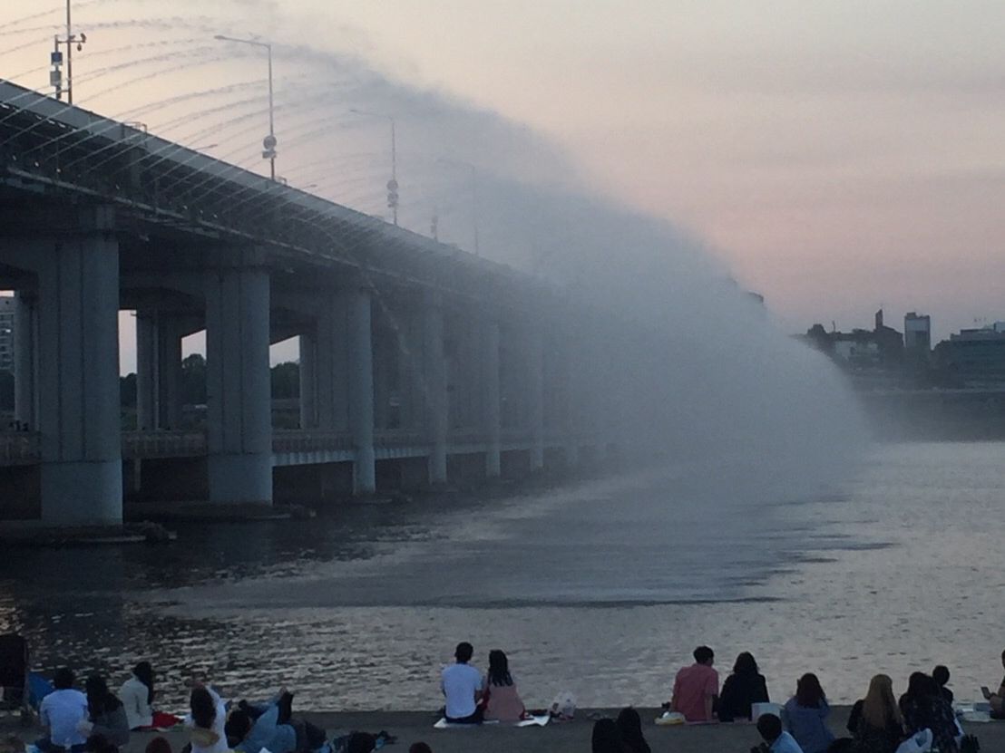 噴水ショーは、完全に暗くなかったせいですかね、、ちょっとカラフル感が物足りなかったです。それでも綺麗でしたし感激でした。遠くに見えるソウルタワーといい、画的にもとても良いです。10分間楽しめました。