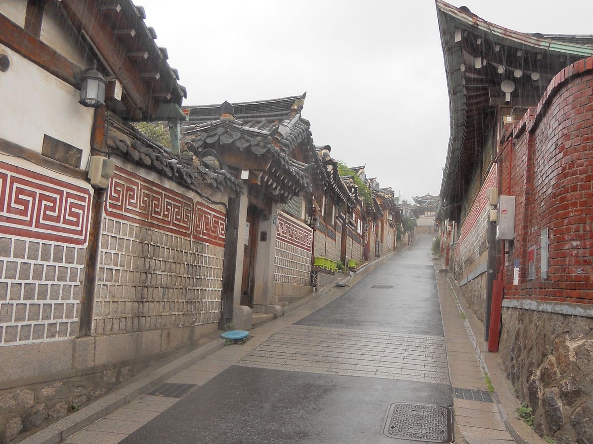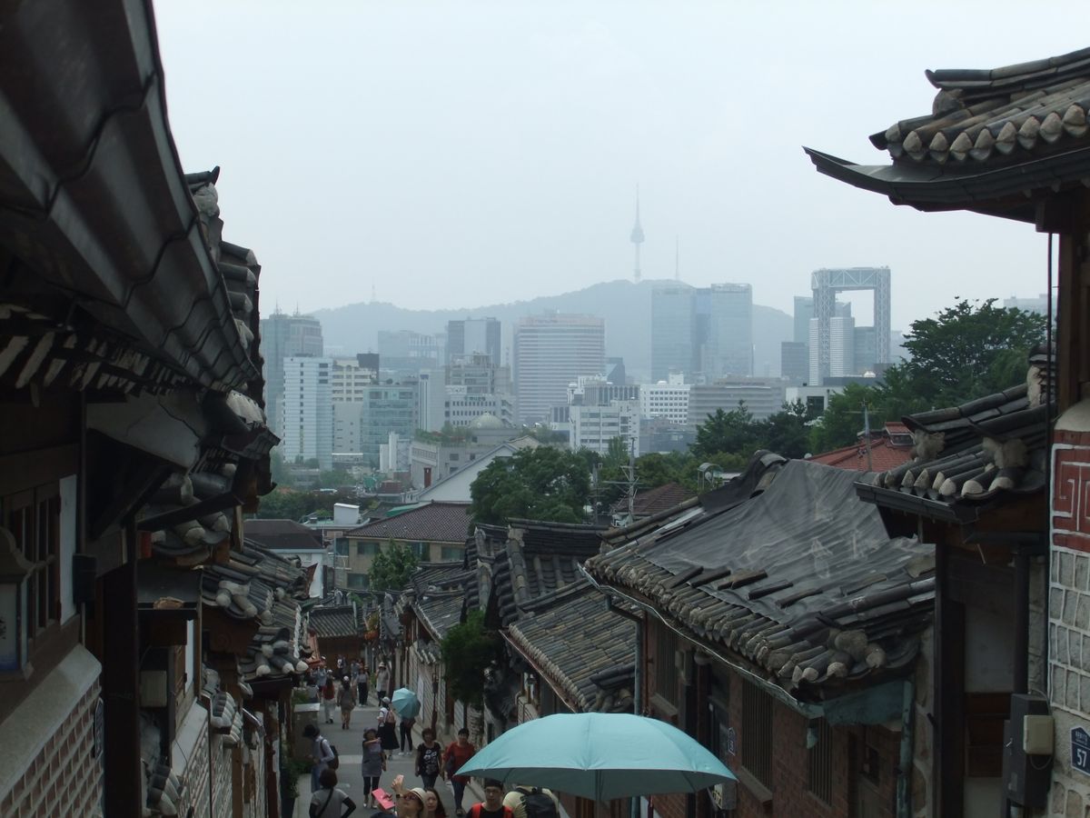北村韓屋村は、坂道なので歩きにくいのですが、雨のお蔭で人が少ない分観光がしやすかったと思います。町を一望できる場所に案内して頂きました、雨も、また良しという感じでした。