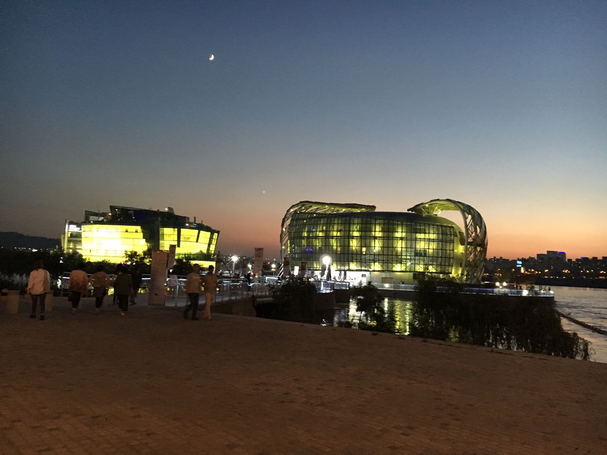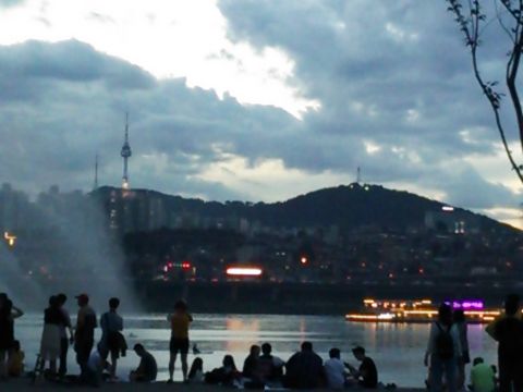 私たちが行く数日前は記録的な大雨で旅行前日くらいからお天気は回復。ただ漢江はまだかなり濁っていて水量も多め。ガイドさんの説明によると、前日の噴水ショーはなかったとのこと。向かう車中でガイドさんが何度もソウル市に確認の電話をかけていましたが、結局噴水ショーが行われるかわからないまま盤浦大橋に到着。地元の人たちも沢山待っていましたが、時間になっても噴水は無し。自力で行ってもその情報は知らなかったであろうと思いあきらめましたが、今回のツアーの目的は噴水ショーだったのでとても残念でした。