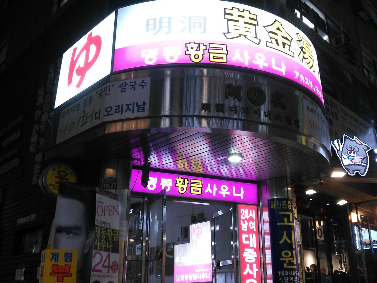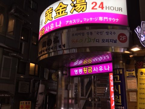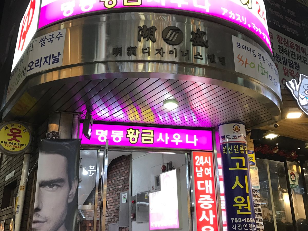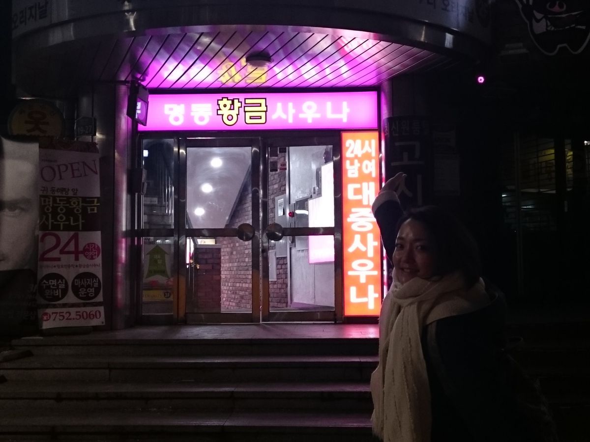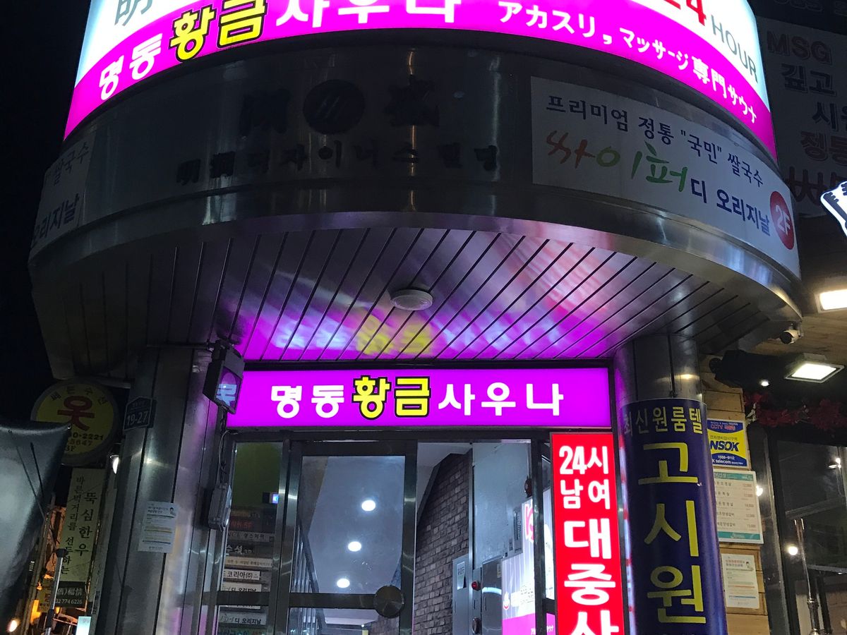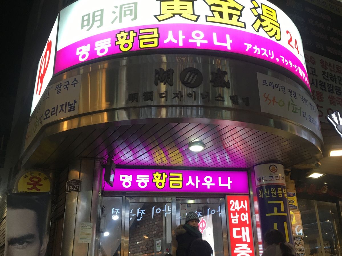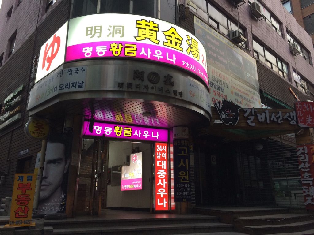 -12度の極寒の中、明洞の繁華街の脇道を入ると黄金サウナの看板がとても目立つのでわかりやすいです。