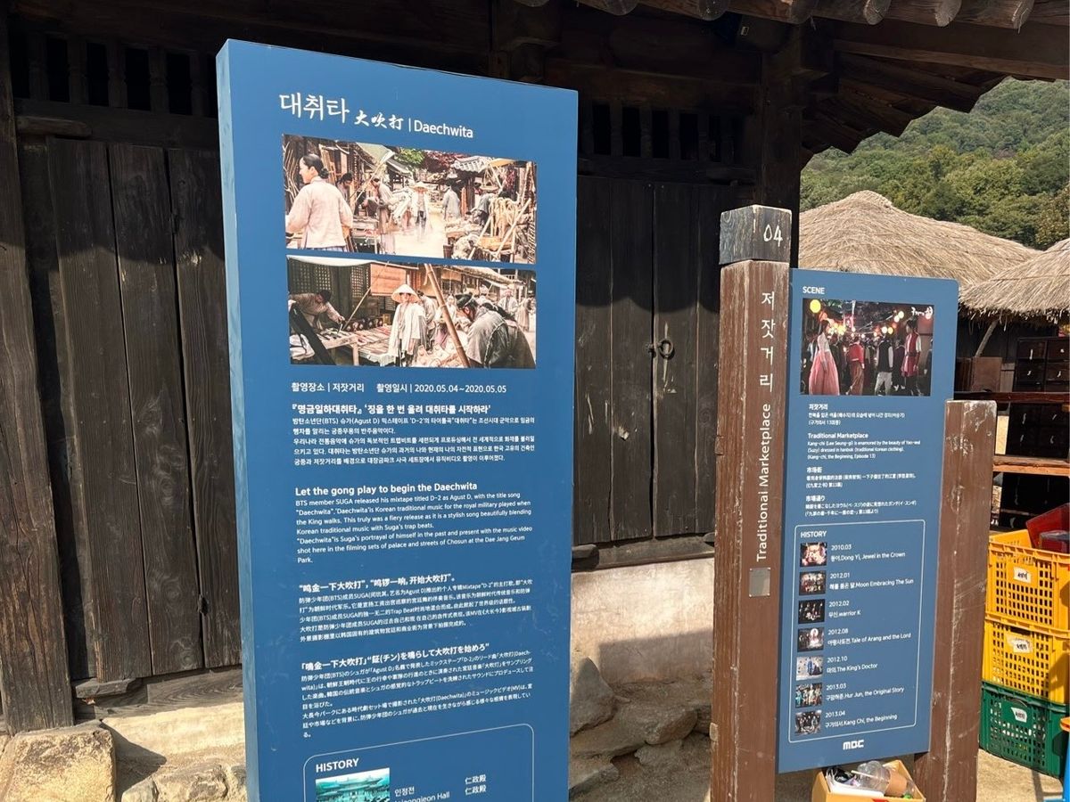 BTS聖地を巡るツアーで大長今パークが行程に入っているツアーに行きたくて参加しました。ガイドのキムさん(男性)が持参のiPadの写真や映像を見せてくれながら、パーク内や行く先々で、その場所がどんなドラマの場面やMVで出てきたか日本語で教えてくれたのでとても楽しく効率よく回れました。ちょうどジミンさんの誕生日当日で、油井食堂は満席のため、又カフェヒュガの塩パンは売り切れてて食べることは叶いませんでしたが、見学とお茶することはできました。代わりの近くの食堂(美味しかった!)と、別のお店ですが塩パンも用意してくれて誠意を感じました。期間限定ですが景福宮をチマチョゴリを着て夜間拝観できたことは良い思い出です。車で連れて行ってくれるので少し遠いところでも、行きたいところをギュッと1日で回れるとても良いツアーでした。キムさん、ありがとうございました。