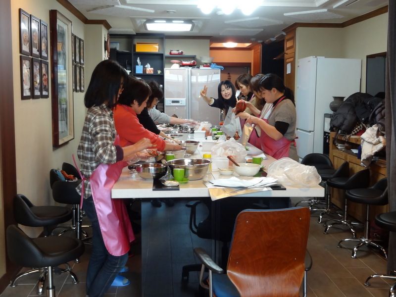 妻と妻の友人と3人で参加しました。李家でのキムチ作りは2回目です。前回はサランチェの方に伺いました。ここの味付けは日本人好みなので、また作りたくなり、今回は行きやすい明洞の方に行ってきました。教室に到着し、入口のドアを開けると、そこにどこかで見たようなチマチョゴリ姿の女性。何と前回と同じ先生です。偶然?先生に聞いてみると、勤務はシフト制との事で、その日はたまたま明洞の教室だったそうです。今回も十分楽しめましたし、味もマッシソヨ(^o^)/でした。李家おススメです。