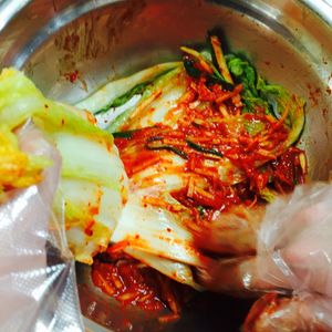 本当に1時間でできるのか心配でしたが、大丈夫でした。すべての材料が準備されていて混ぜるだけだと思っていましたが、大根を切ったり、調味料を調合したり、白菜にたれを塗りこんだりとかなり本格的な気がしました。韓国の大根が日本のものに比べて水気が少なく甘いということも初めて知りました。次回はカクテキも作ってみたいと思いました。注意したいのは、キムチは手荷物として機内に持ち込めません。確かに預ける荷物に入れてと言われていたのですが、うっかり手持ちにしてしまい、セキュリティーで没収されました・・・・。非常に残念です。