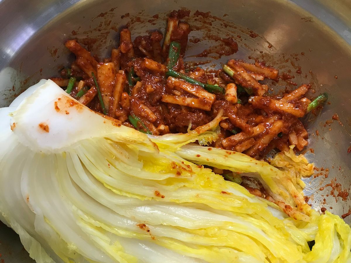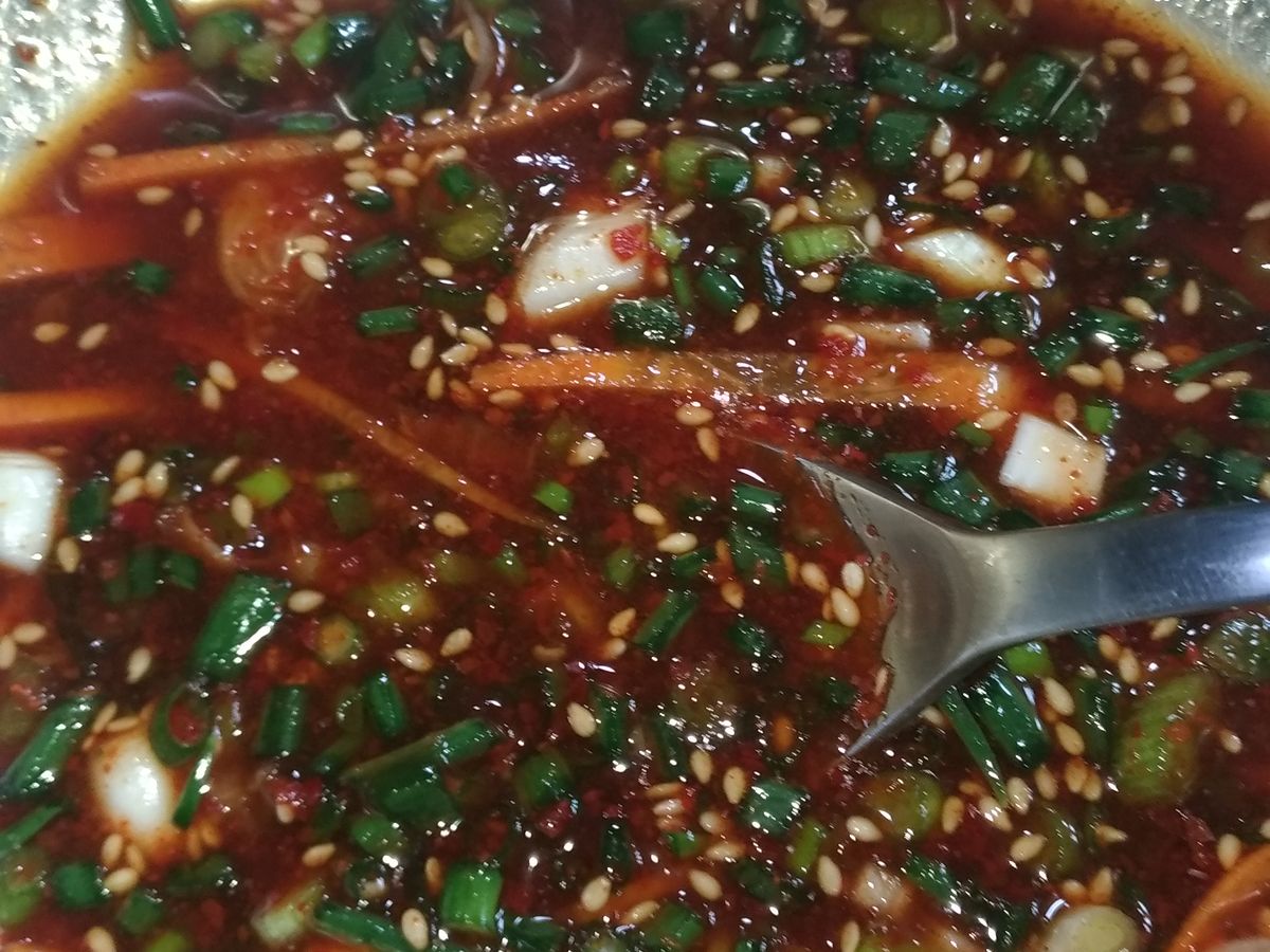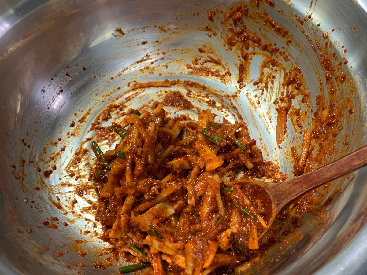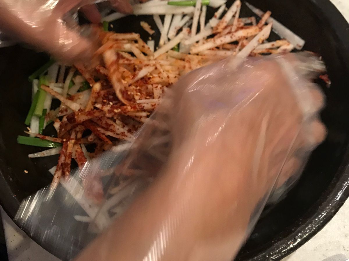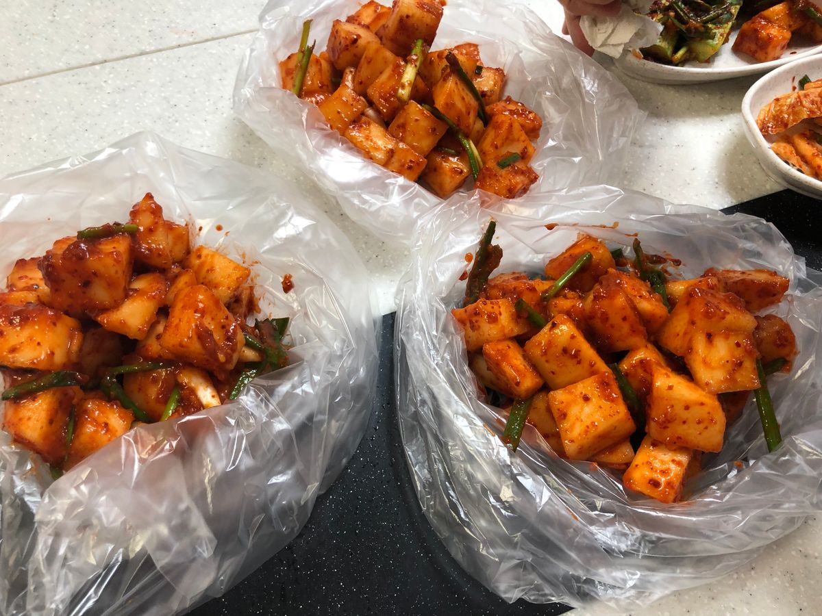 奥さまがおしゃべりしている間に旦那さまがコツコツと静かに準備。丁寧に教えてくださいました。できたてキムチ最高ですよ。仲良しご夫婦のキムチ教室、行ってみてほしいです❣️