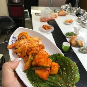 とにかくウーさんの情熱的かつ情報満載のトークが楽しく、あっという間に白菜、キュウリ、大根、エゴマの葉のキムチが作れました。キムチはこんな材料でこんな風に作るのか!と驚くと同時にキムチ完成後に作ったキムチをマッコリとごはんで頂く事ができ、作り立てでまだ漬かっていないキムチでも美味しいのに感動しました。夜にはウーさんに紹介して頂き、ウーさんも家族で訪れていた焼肉店で一緒に食事させて頂き、大変貴重な時間が過ごせました。キムチ作りだけでは終わらない韓国ならではの体験として大変オススメです。