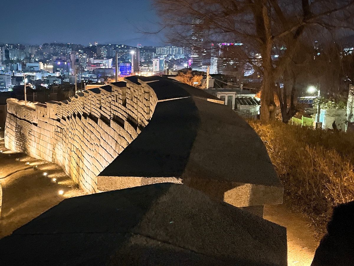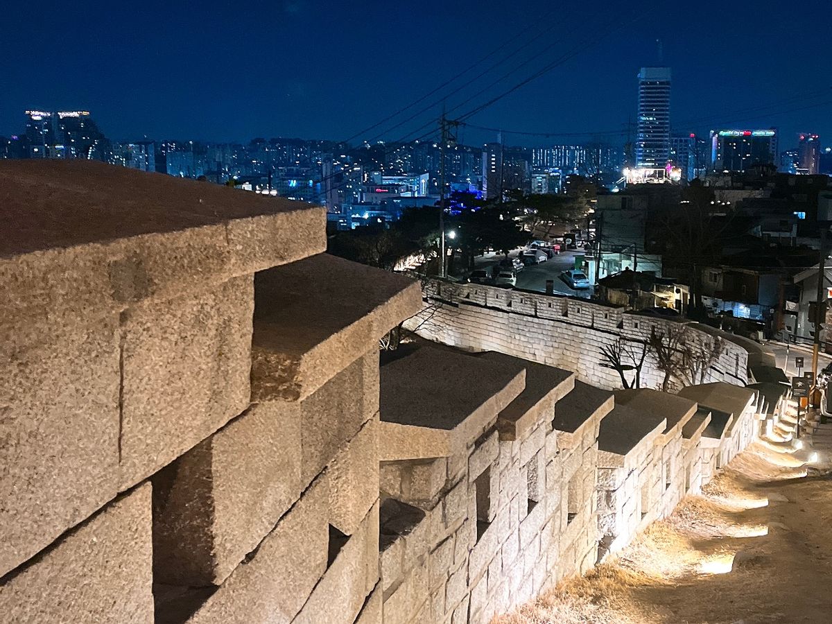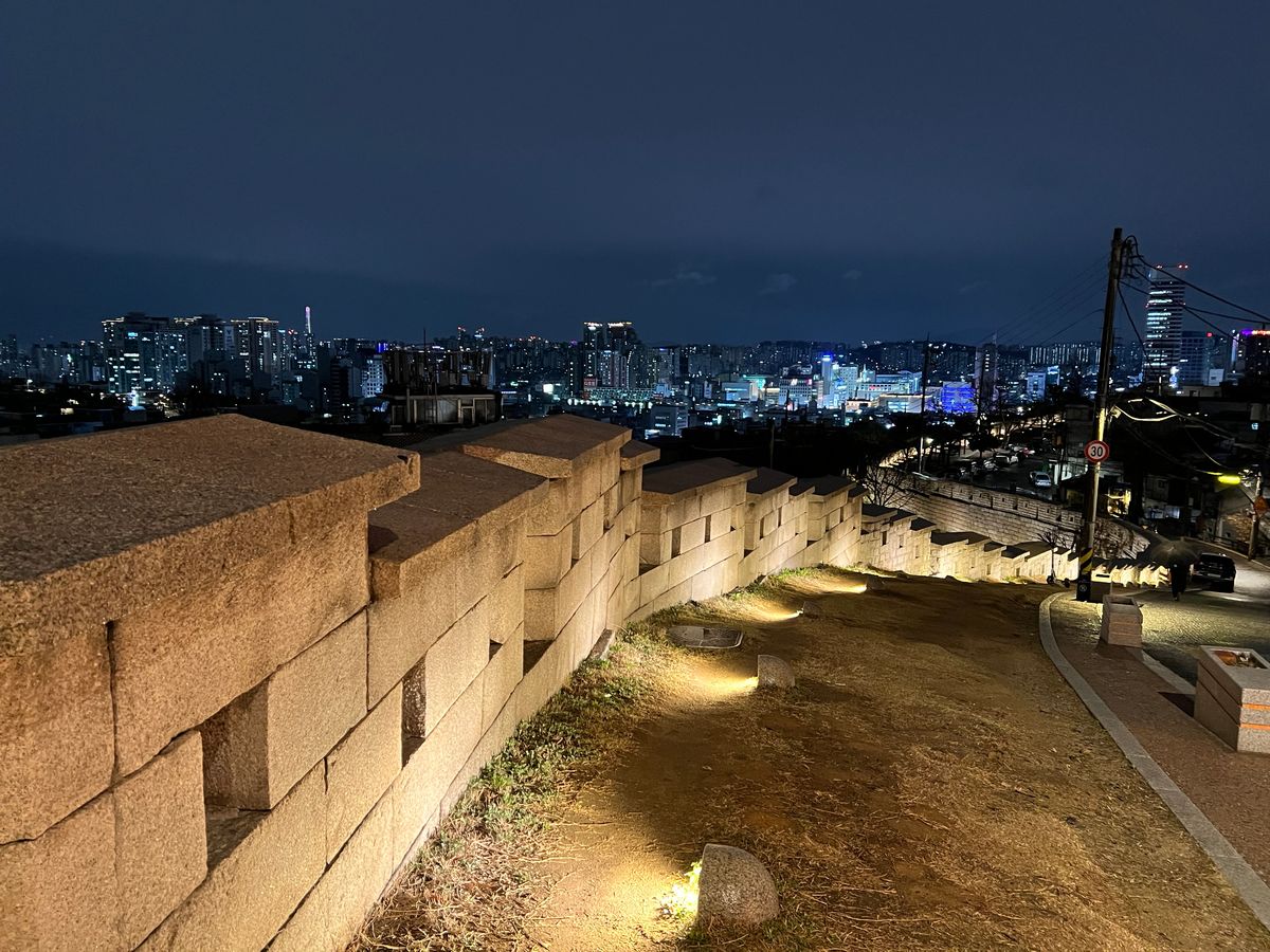 500年前の石垣がライトアップされて美しく、かつてSeoulの街をぐるりと囲って街を守っていた姿を思い起こさせます。その文化財に触れることもでき、感激。