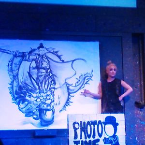 コントの様におもしろおかしく進めながら、音楽やダンスにのせて様々な有名人の絵を描いていきました。