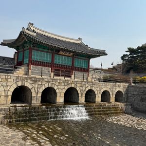 華城行宮まで数分車で移動してから、見学しました。車窓からも城内の様子を見られ、説明を受けることができます。40分程度見学後、伝統武芸24技と公演を見ることができました。ガイドさんから正面から見る方が良いと教えていただきましたが、本当に気迫あふれるものでした。