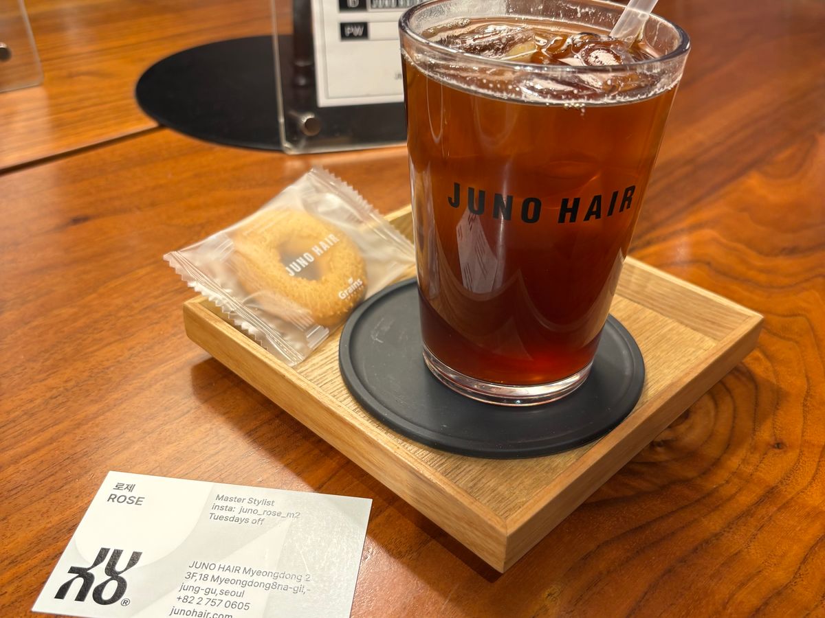 その後シャンプー台に移動してここでも軽いマッサージ、その後おでこから頭頂に向けてちょろちょろとお湯を流してもらいこれがまたかなりの癒しでした。その後席に移動してロゼさんにカットの希望を告げて希望通りに切ってもらい、頭頂が少しペチャっとなりやすい悩みを告げると、ブローでのボリュームの出し方を教えながら仕上げてくれて実際終了後にはボリュームが出て見えてロゼさんの腕に感動しました。終始名前で呼んでくれるし名刺もいただいて、また渡韓時にはロゼさんにお願いしたいです。