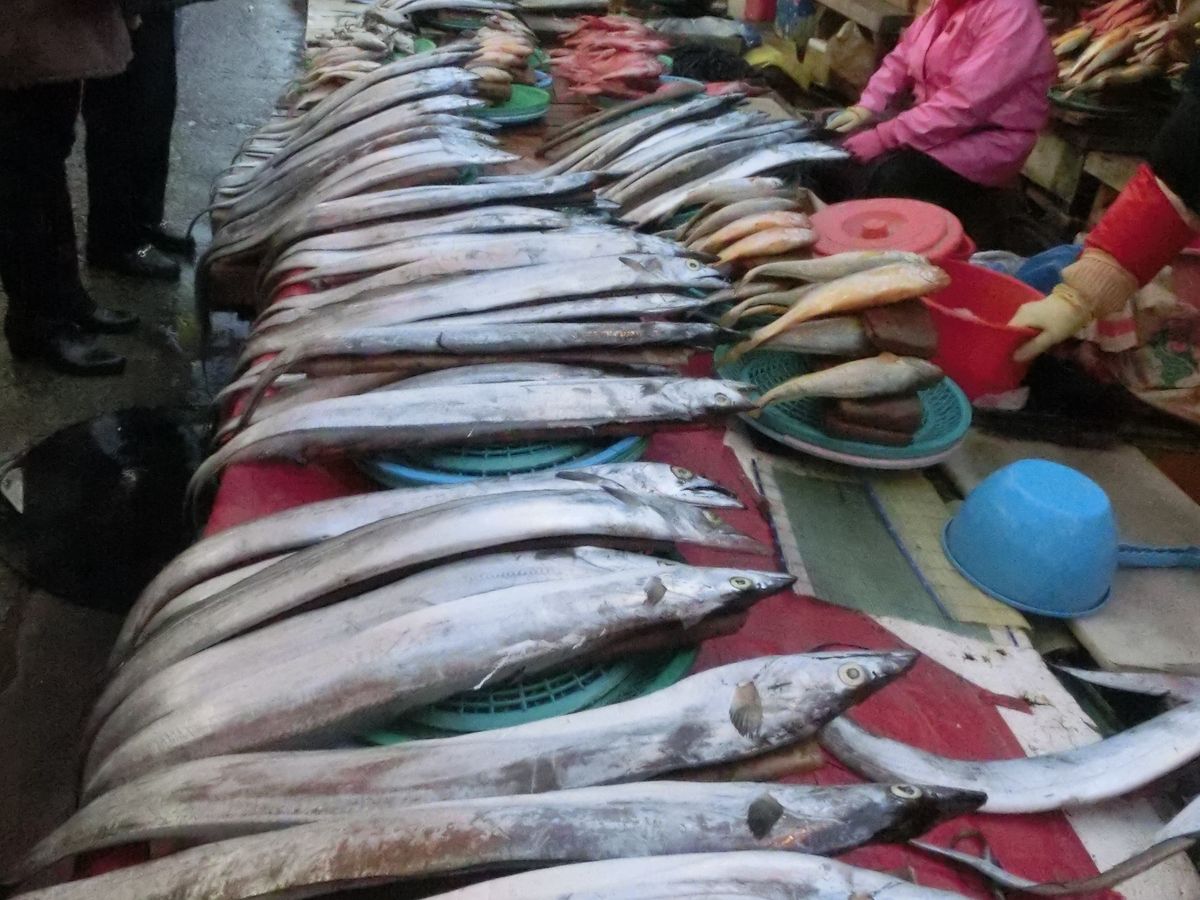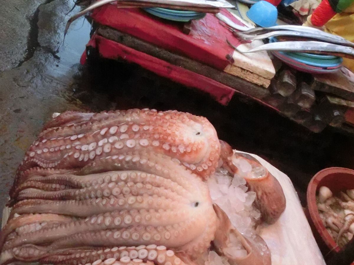 昔ながらの魚を売るおばちゃん達と船から魚を運び出す漁師さんの向こうには、ロッテ百貨店のビルがそびえ立ち今と昔が共存する不思議な景観です。