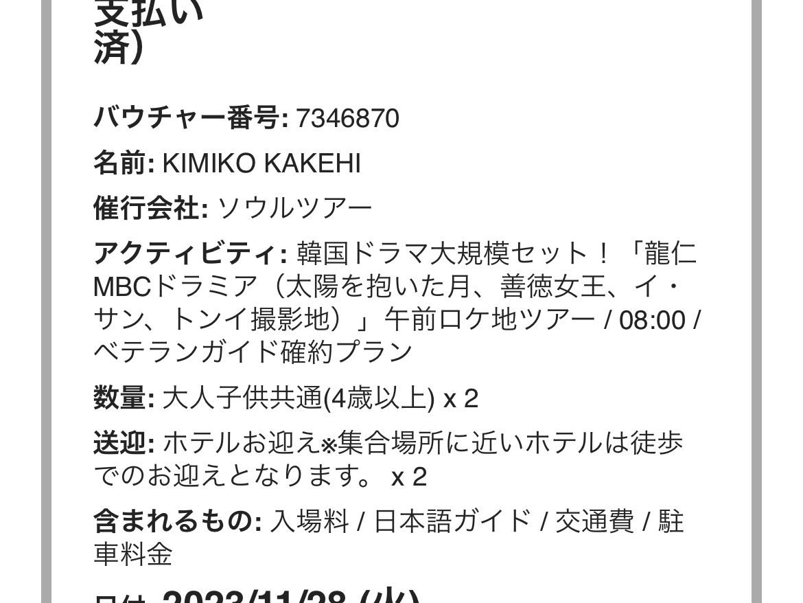 初の韓国一人旅で全く土地勘もなかったため、絶対に行きたかった行きにくい場所と聞いていた大長今パークが含まれていて、ホテルピックアップもしてくださるこちらのツアーを選びました。見たかった場所ばかりを効率良く巡る事ができて大満足です。ガイドのキムさんは聖地に関しても、ドラマについても知識が豊富でとても良い方でリラックスして楽しい時間を過ごせました。参加が私一人だったので、お値段は割高となりましたが、そんな事は忘れてしまうくらいに思い通りの旅となりました。比較的混雑の少ない日で食事も並ばず入れましたし、欲しかったパンもありました。日迎駅が工事中との事で代わりのプランを追加してくださったのも、むしろ行きたかった所で嬉しかったです!また機会があったらここのツアーに参加したいです。