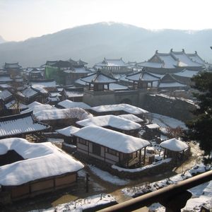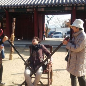 現地は山あり、谷あり、林ありのかなりの田舎(笑)ですが、セットとは思えない本物のような重厚な造りの宮殿や寝殿、立派な庭や、庶民の家などに、韓流時代劇をあまり知らない友人も、すごい!楽しい!と喜んでました。ちょうど数日前に降った雪がまだ少し残っていて、風情ある景色がまるでドラマのワンシーンのようにロマンチックでしたよ。