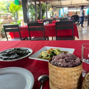 織物のパーノン村では、織物以外にきれいな紙漉きの作品なども買うことができる。昼食は川海苔ともち米を含む、ごく標準的なラオス料理だった。