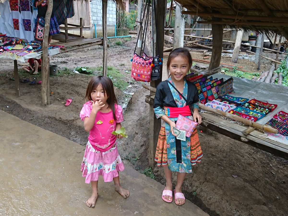 帰りに、モン族の村に寄りました。子どもたちが民族衣装を着ていて、写真を撮るには何か物を買う仕組みのよう。同行者には「(1ドルを)払って、1枚写真を撮る感じだなあ」と言っている人もいました。同感。ただ、しつこくはなく、嫌な雰囲気はなかったです。