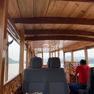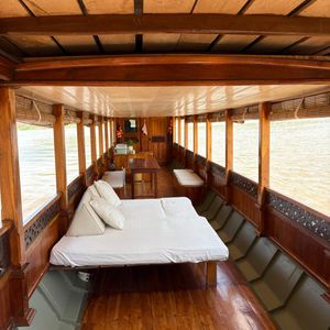 ツアー詳細にはほとんど書かれていないのですが、パクオー洞窟へはメコン川を船で行きます。船というより舟?(苦笑) すごい長い木製の舟ですが座席も車のシートが設置されており20人はゆったり乗れるのではないでしょうか。
