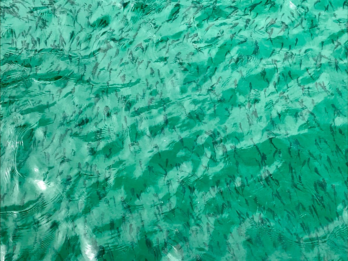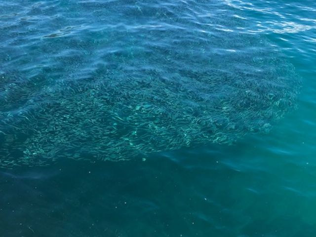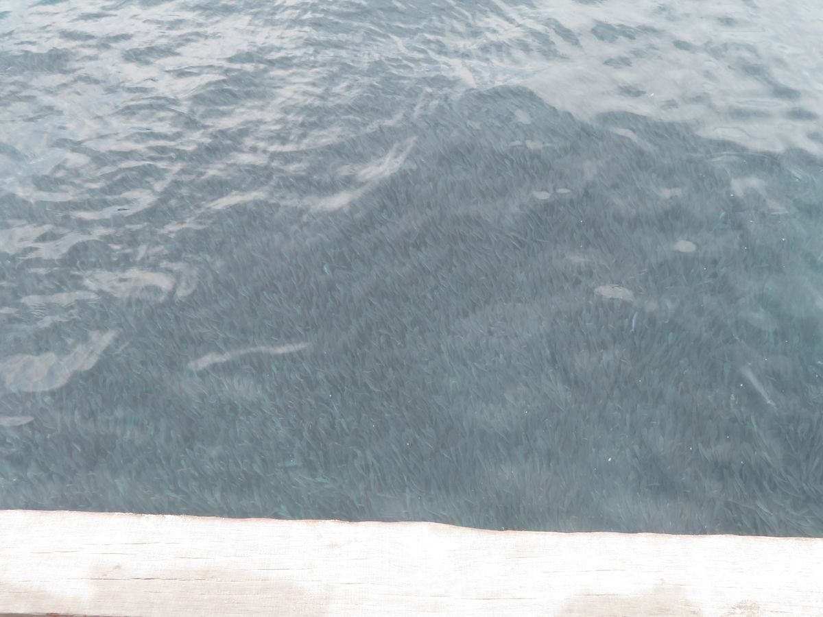 遊泳エリアにも魚がいっぱい寄ってきて、水の上からでも見えます。