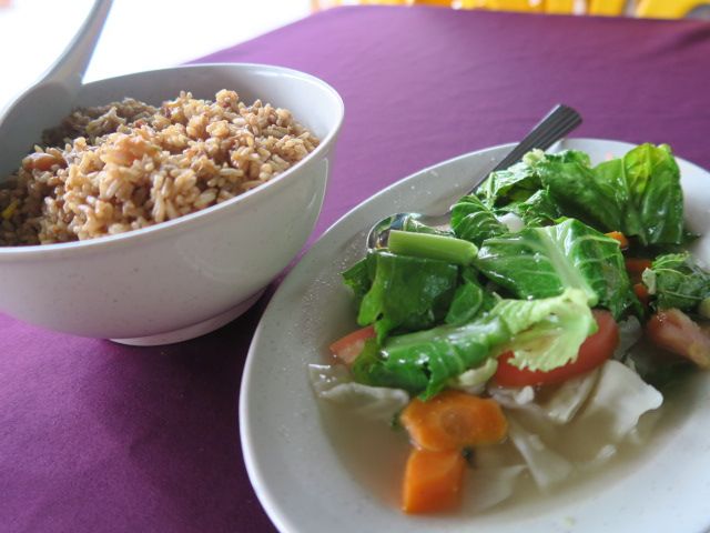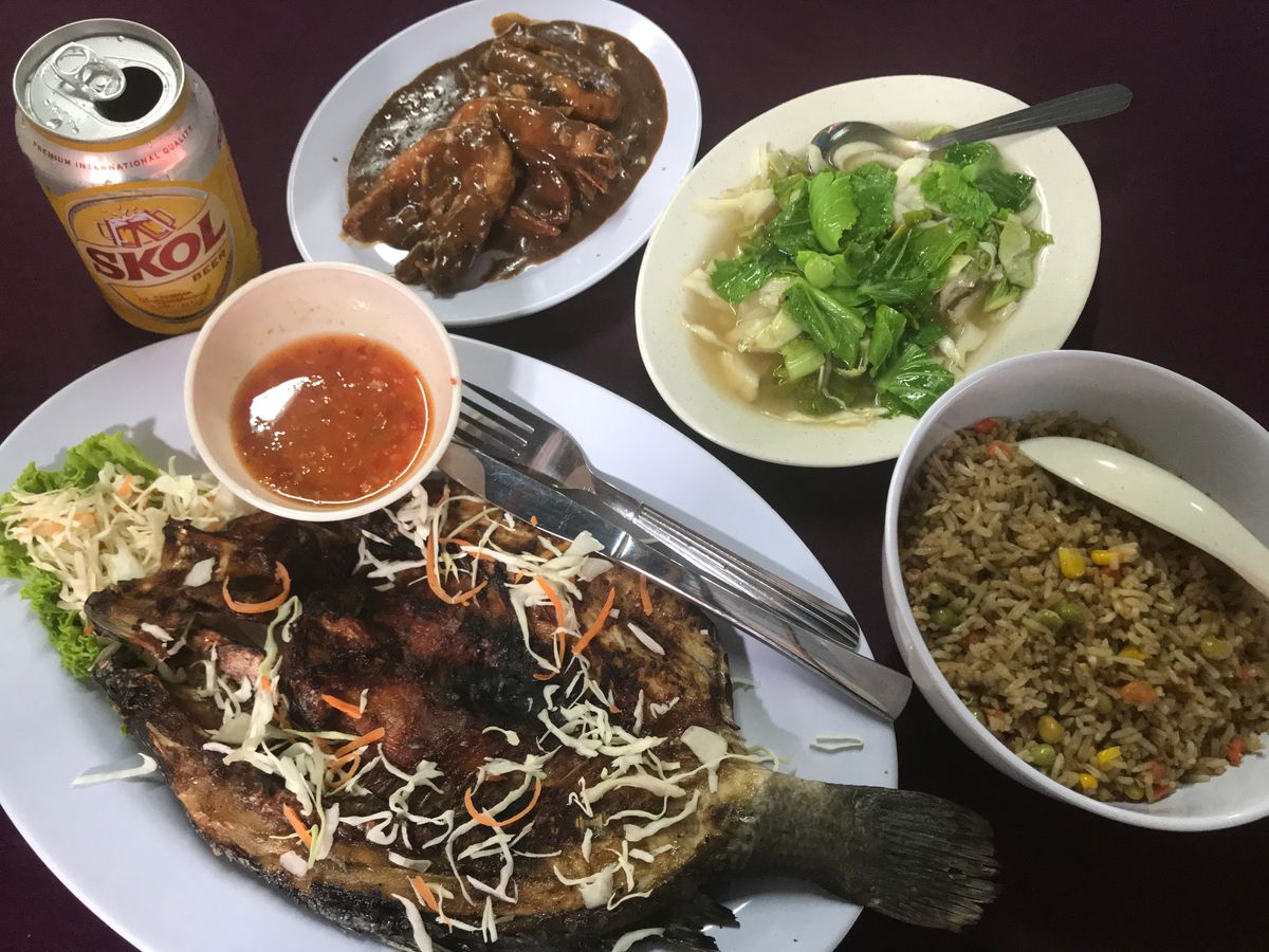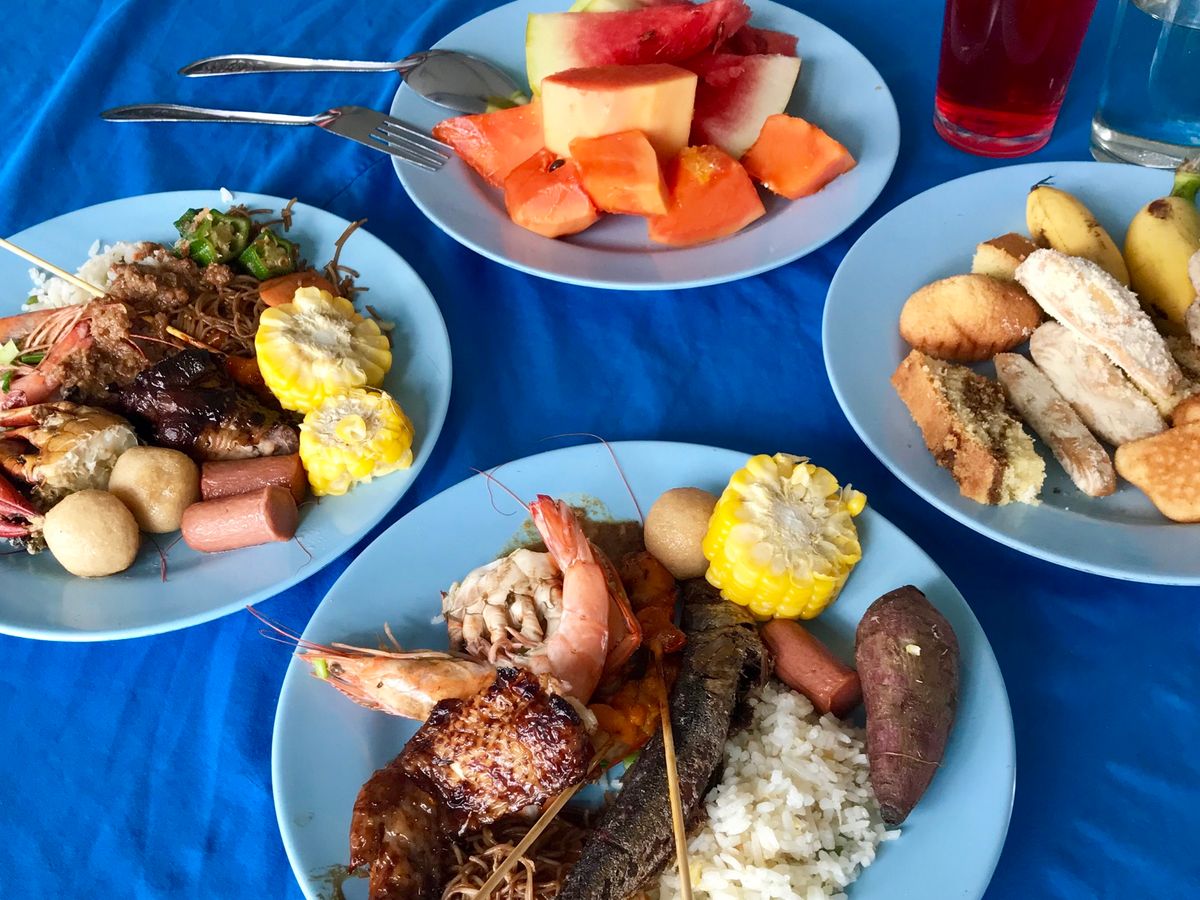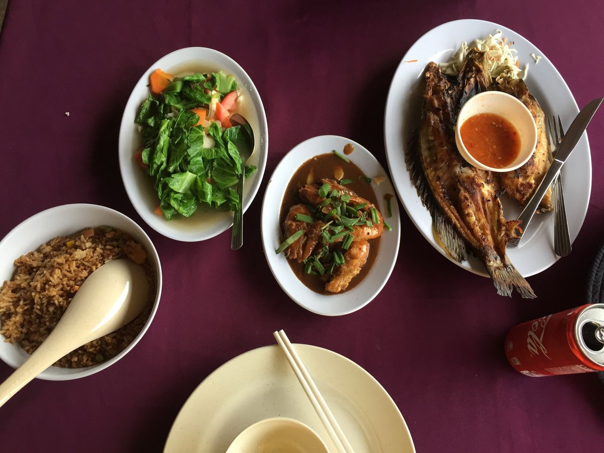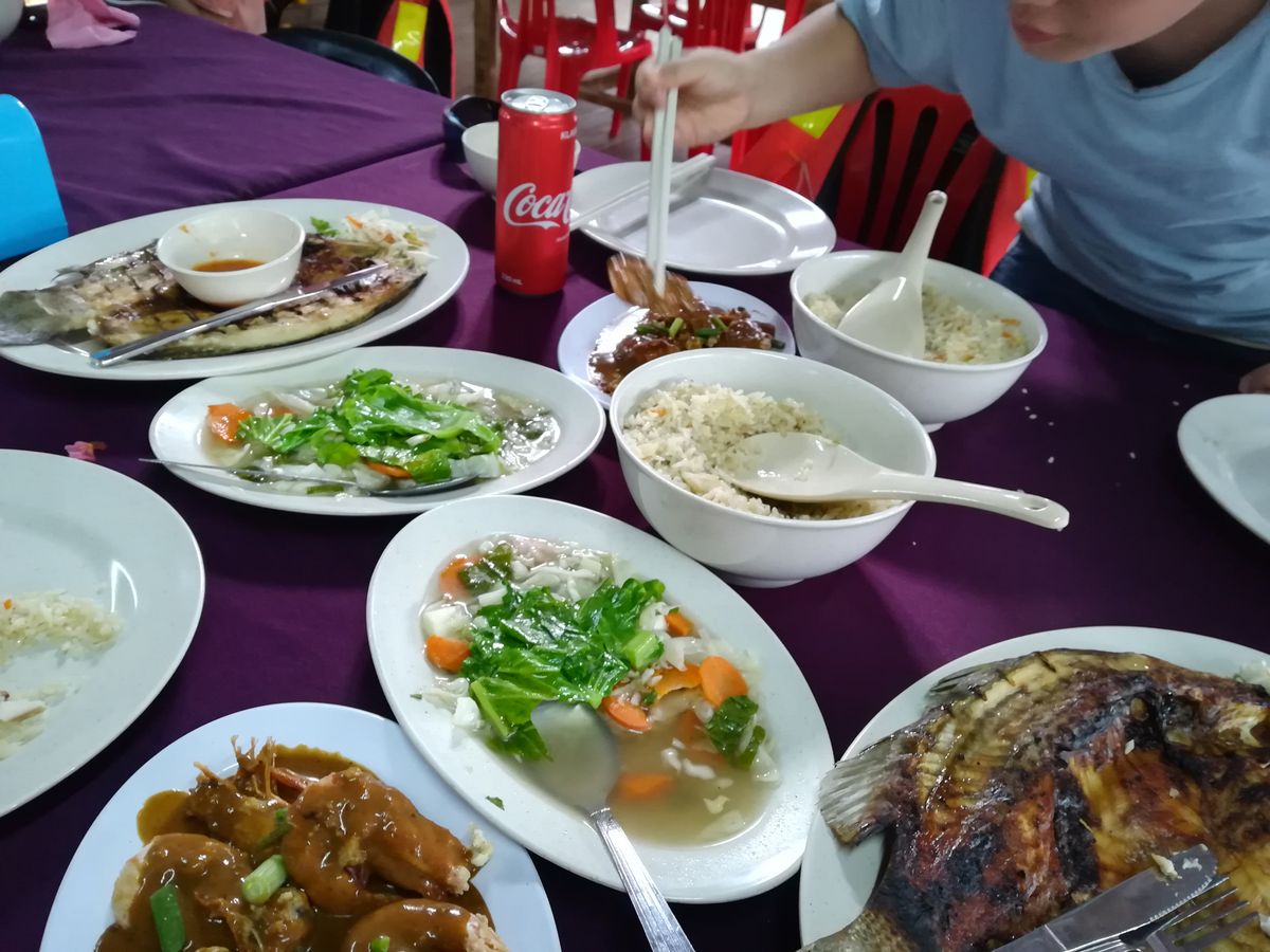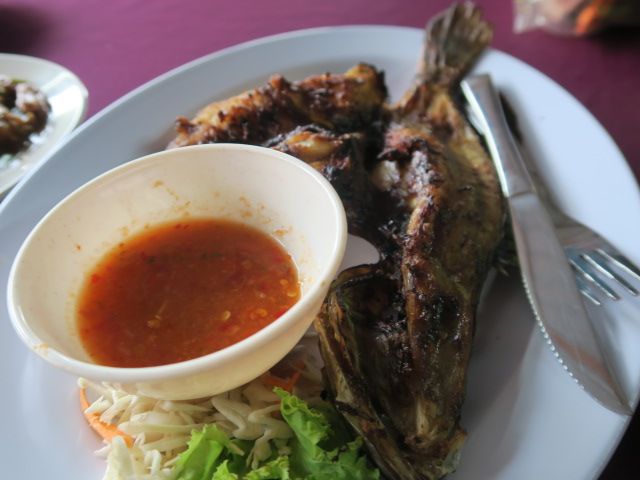 さらに夕食(5)。マングローブの森の中に浮かぶ養殖場兼レストランで、今さばいたであろう魚が丸々焼かれて出てきました。他にも色々と。ボリューム◎。