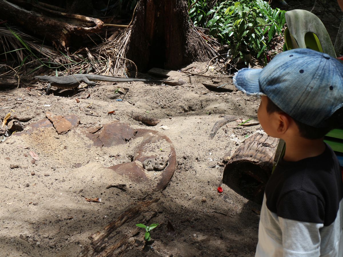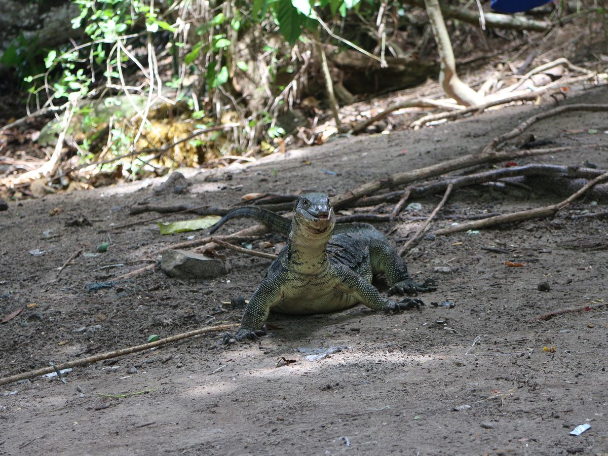 バイキングの準備がはじまる頃には、山からミズオオトカゲがわらわら降りてきて、目の前で迫力ある姿を見ることができます。運が良ければ食べ残りを投げてくれるので、食べ物に群がってくるところも見れます。ミズオオトカゲが見れるのは、入島した桟橋を左奥に行った柵のあたりなので、混雑していると降りてきていることに気づいていない人も多いようでした。ぜひ、バイキング後に見に行ってほしいです。