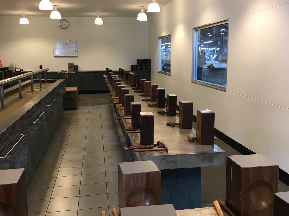 次はピューター工場でのお皿づくり体験。工場見学の後に円状のプレートをひたすら木槌で叩いて丸みを持たせて仕上げて行きます。なかなか難しかったですが、店員さんのユーモア溢れる?手助けもあり完成しました。