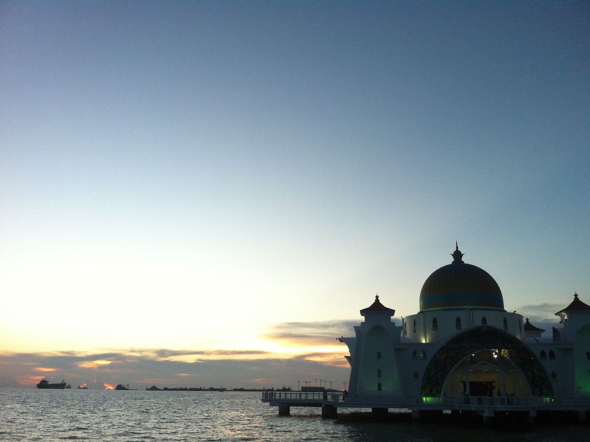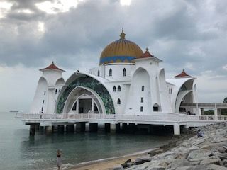 マラッカに着いて、最初に「海辺のモスク」を見学しました。モスク内は半ズボン、タンクトップ等の露出の多い服では入れません(まあ、忘れてもモスクで代わりの物を貸してくれますが)。また、女性はヒジャブ(ムスリム女性が頭に被っている布)が無いと入れないので、これもモスクで貸してくれます。