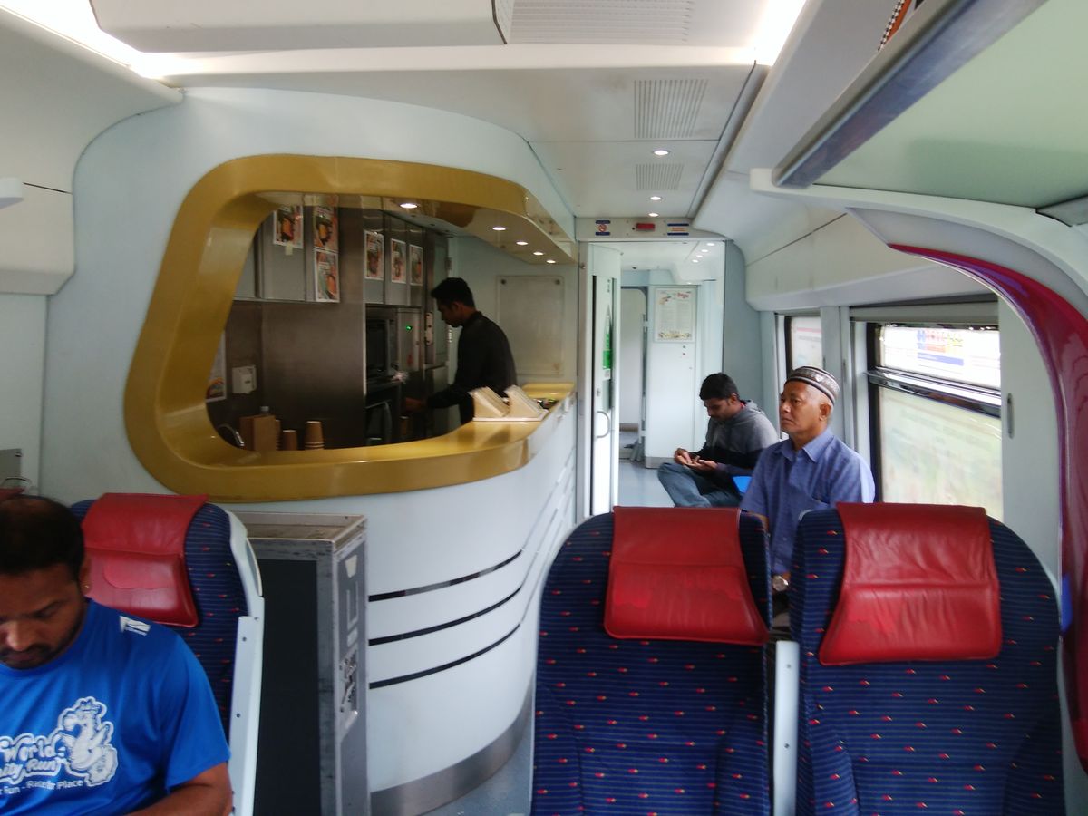 なにはともあれ乗車です。ガイドの王(ワン)さんも一緒に乗車します。近代的な見た目に違わず、特急電車の乗り心地は良好です。列車には、日本では最近あまり見られなくなったビュッフェ車両もあり、サンドイッチ等を売っています。