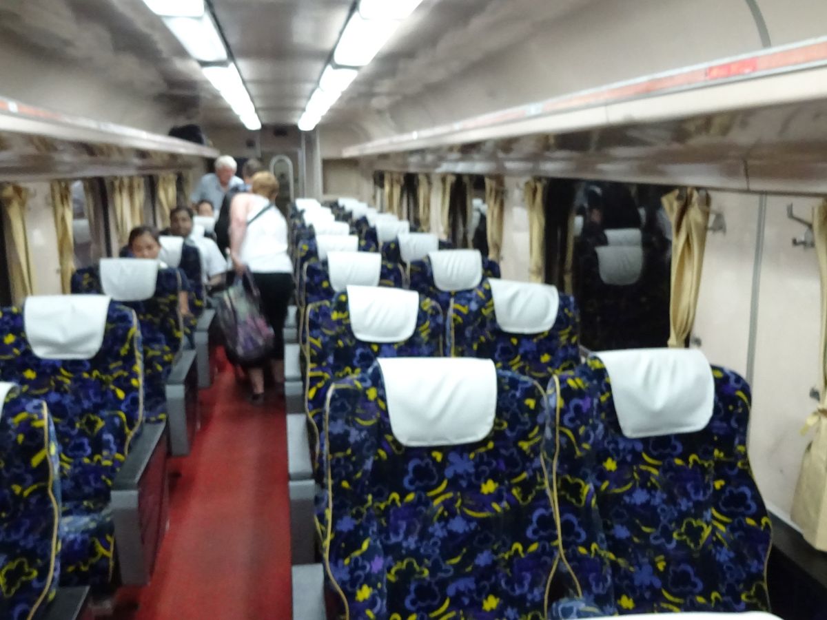 マレー鉄道は、朝ホテルにむかえに来たバスが、到着した駅に着いて居る位、ゆっくりのようです。別料金15リンギットを支払って、一等車に乗車しました、座席が横に2席と1席で快適でした。