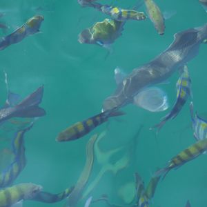 フェリーを下りて島へ行く桟橋から、たくさんの魚や小さいサメが見えました。