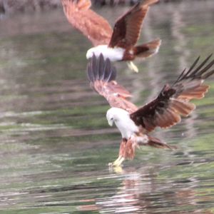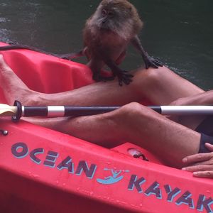まずボートで鷲の餌付け場へ向かいます。到着と共にガイドさんが鶏肉を撒くと、どこからともなく多数の鷲?と思える小型の鳶?のような鳥が出てきました。それはそれで、迫力があり良かったです。その後、カヤック練習場で少し練習後、ボートにカヤックを積んだり引っ張ったりして上流へ移動し、カヤックを開始します。まず、可愛いサルがガイドさんのカヤックに泳いできました。その後子連れの母サルもガイドさんのカヤックに木を伝って乗り込み餌をおねだり。カヤックでマングローブの中を移動しながら、ガイドさんが撮影スポットで写真を撮ってくれます。(その時も名前を完ぺきに覚えていました)最後に洞窟をカヤックで通過して、カヤック終了です。ボートでカヤックを練習した近くの水上レストランへ移動し、夕食(この手にツアーの食事にしてはまずますな内容)を食べてツアーは終了します。