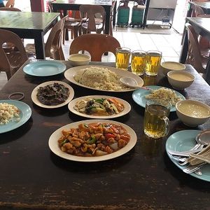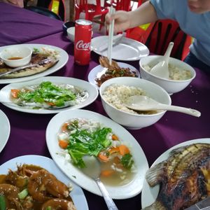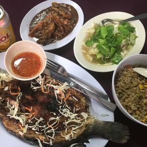 さらに夕食(5)。マングローブの森の中に浮かぶ養殖場兼レストランで、今さばいたであろう魚が丸々焼かれて出てきました。他にも色々と。ボリューム◎。