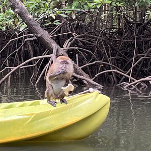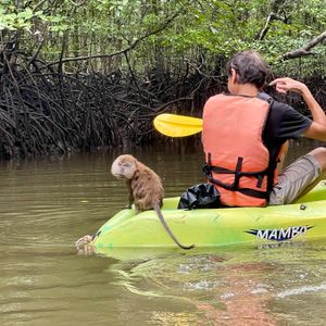 1人参加で倍額なので少し割高だな…と思っていましたが、実際参加すると、1人参加の分、ガイドさんが付きっきりで色々教えてくださり、本当に充実したツアーでした!マングローブの木々を水面に近い高さから見上げると、その壮大さに息を飲みました。また上流の人工的な音の全くしない静かな世界をカヤックで進むのは、ちょっとした冒険のようで本当に楽しかったです。さらにはガイドさんがいろいろな動植物(マングローブの種、小さなカニ、ハリセンボン、さらにはガイドさんが赤ちゃんの頃から知っているという野生の猿まで!)を私のカヤックに乗せてくださり、間近で観察することができました。それ以外にも、オオトカゲやカワセミも見ることができ、疲れを感じる暇もなく、あっという間に時間が過ぎてしまったなと感じるほど楽しいツアーでした!