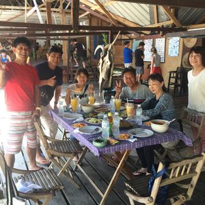 ランチには、水上コテージのの上でナシミニャというローカルの食事を頂きましたが、これが美味しくて日本人の口に合うと思いました。旅行を終えて振り返ってみても、こちらで食べたナシミニャは自分たち的美味しかったものランキングに入るお味でした。