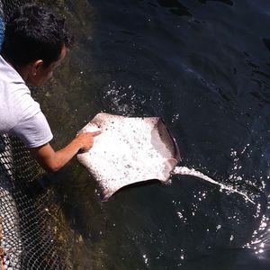 ワシの餌付けや養殖場見たりカニ釣りの網仕掛けたり世界遺産の所で写真撮影したり。養殖場ではエイに触りました。